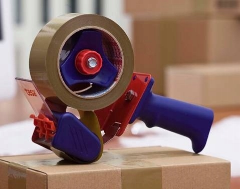 Диспенсер Tesa® для ручного наклеювання пакувальних стрічок шириною до 50 мм, оснащений висувним лезом, що захищає від випадкових травм, і системою, що дозволяє регулювати натяг і контролювати силу розмотування стрічки.
