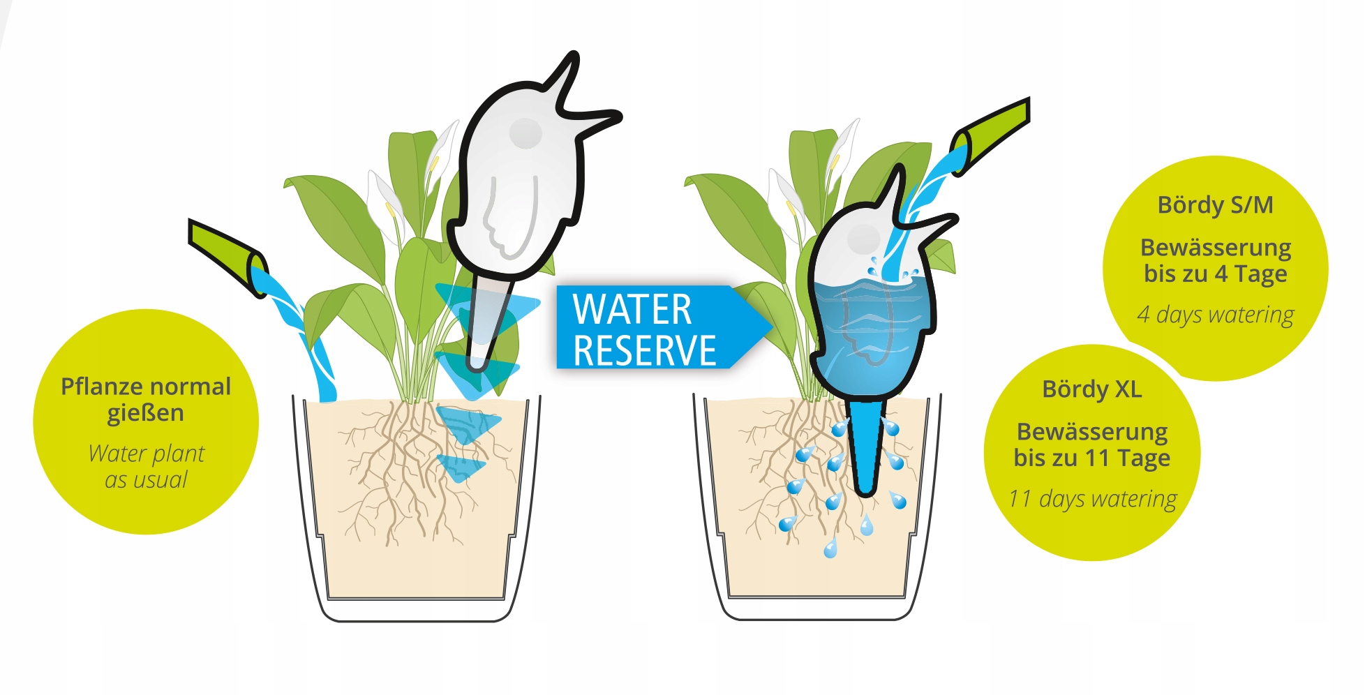 ✅ дозатор розміру S і M забезпечує воду до рослини до 4 днів, залежно від розміру горщика, розташування та водопоглинання рослиною