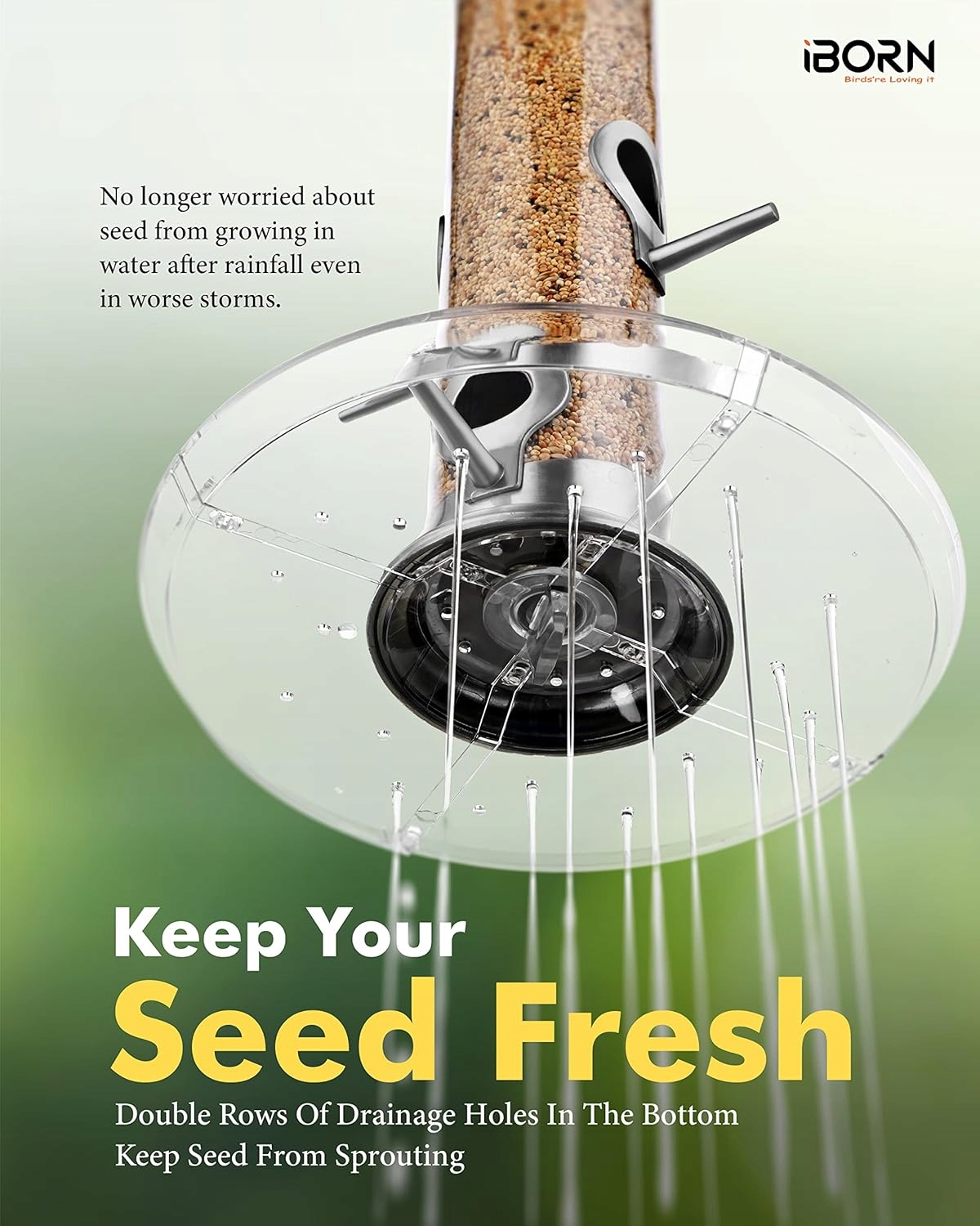 - Насіннєвловлювач і трубчаста годівниця мають подвійні ряди дренажних отворів у дні, які запобігають проростанню насіння під кормом, що забезпечує ваших птахів свіжим насінням.
