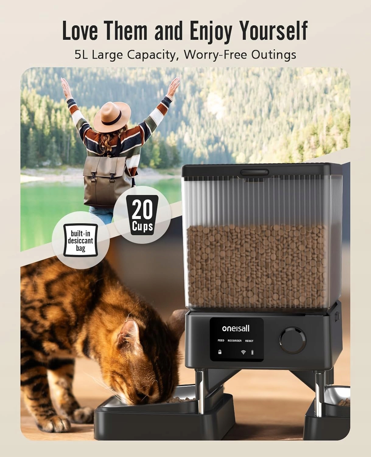 Oneisall Food Machine - це ідеальне рішення для власників котів та маленьких собак, які хочуть забезпечити своїм домашнім тваринам регулярно та свіжими стравами. Завдяки підтримці Wi -Fi (5G/2.4G) та контролю додатків, ви можете регулювати план годування з будь -якого місця, забезпечуючи повний контроль та зручність.