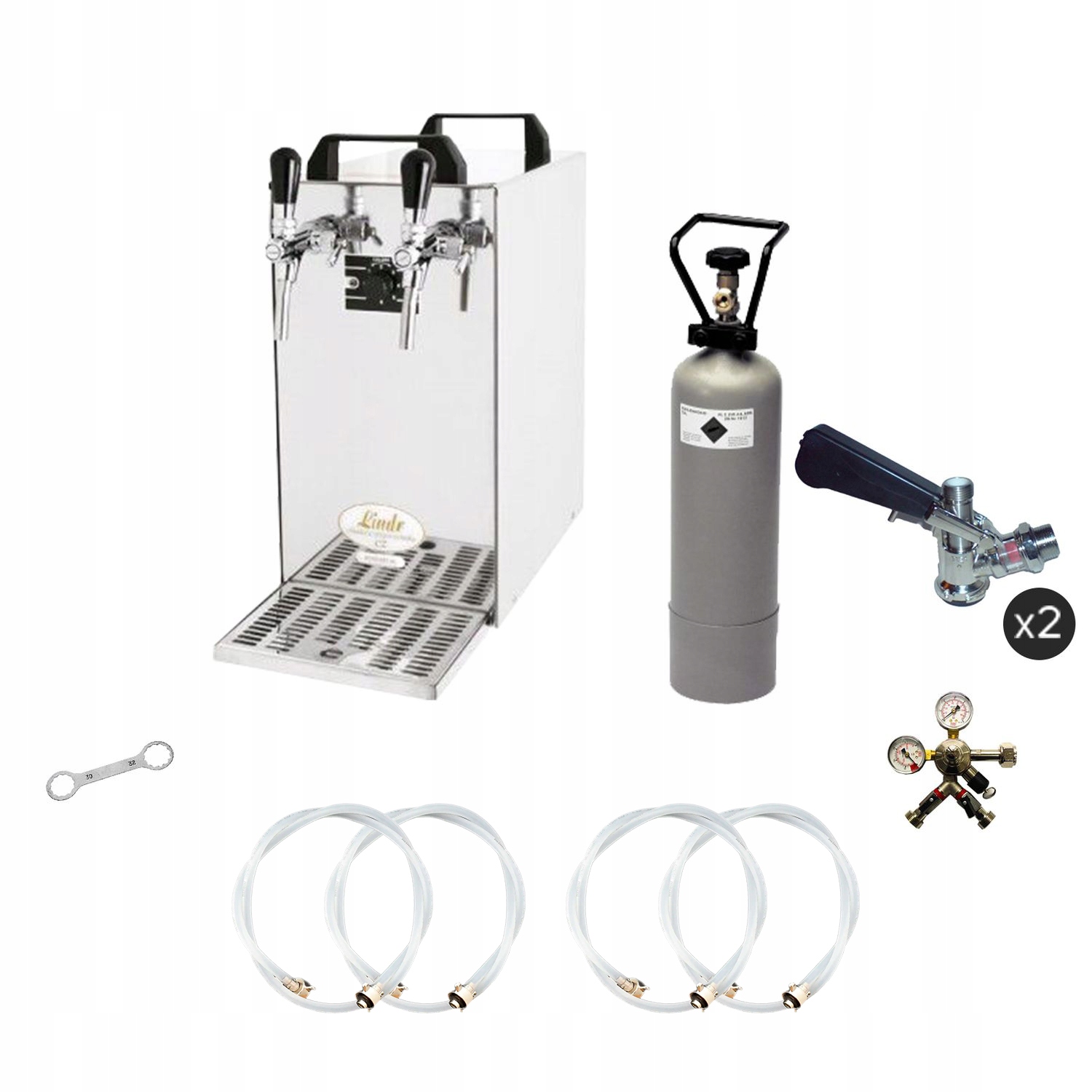 Підключення: John Guest, 1 x 2-лінія редуктор газу CO2 для пива, 3 барний дозатор пива. 1 x CO2 - пляшка, 2,0 кг, 2 х повний шланг CO2, 1,5 м. 2 x John Guest Beer Hose - 3/8 "та 5/8" гвинт 2,00 м - повністю готовий! 2 x Голова, на вибір: без, плоскої, комбінації, кошику, köpi