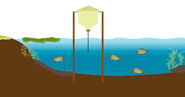Спосіб роботи годівниці дуже простий. Кріпимо на платформу або на стовпи де завгодно. Риба, що плаває під годівницею, рухає рукою та вибиває гранули у воду, а потім їсть їх.