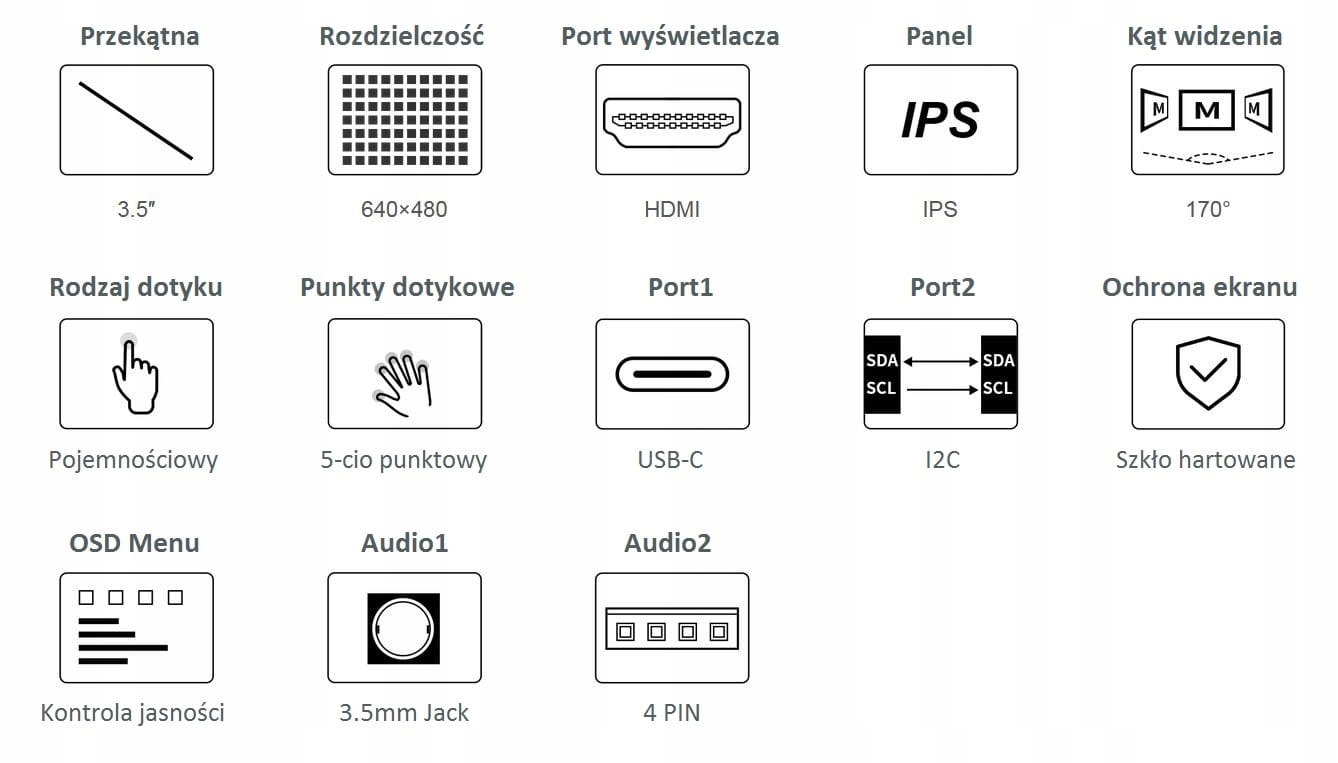 3,5-дюймовий IPS LCD ємнісний сенсорний дисплей, 640×480 з аудіовиходом.