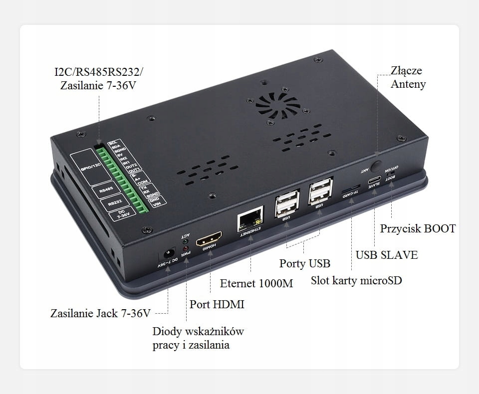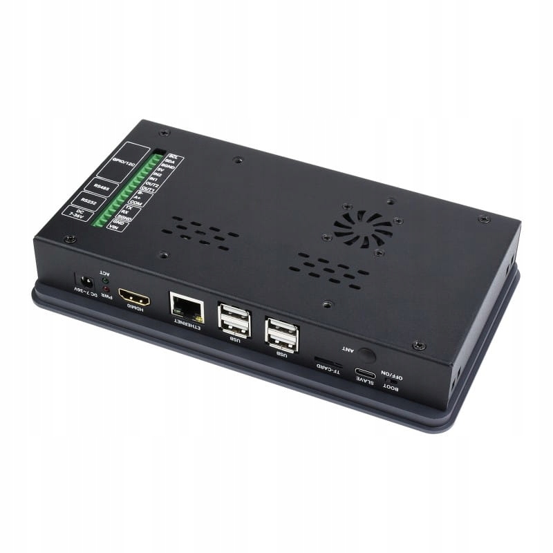 7-дюймовий набір в одному з сенсорним екраном для Raspberry Pi CM4 7-дюймового набору в цілому з сенсорним екраном, призначеним для Raspberry Pi CM4, 5 Мп, корпусом алюмінію. Набір складається з усіх для перетворення системи CM4 на реальний та повністю функціональний HMI. Модуль містить, призводить до спілкування, серед інших, RS485, RS232 або RJ45. Набір вбудував динаміки, камеру та вентилятор! Ми настійно рекомендуємо.