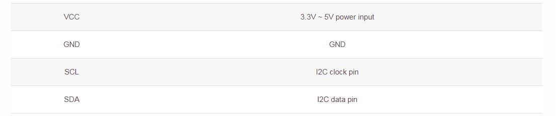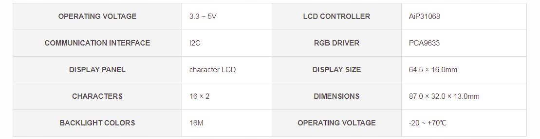 Текстовий дисплей на 16 символів у 2 рядки з підсвічуванням RGB. Працює через шину I2C, джерело живлення 3,3/5 В.
