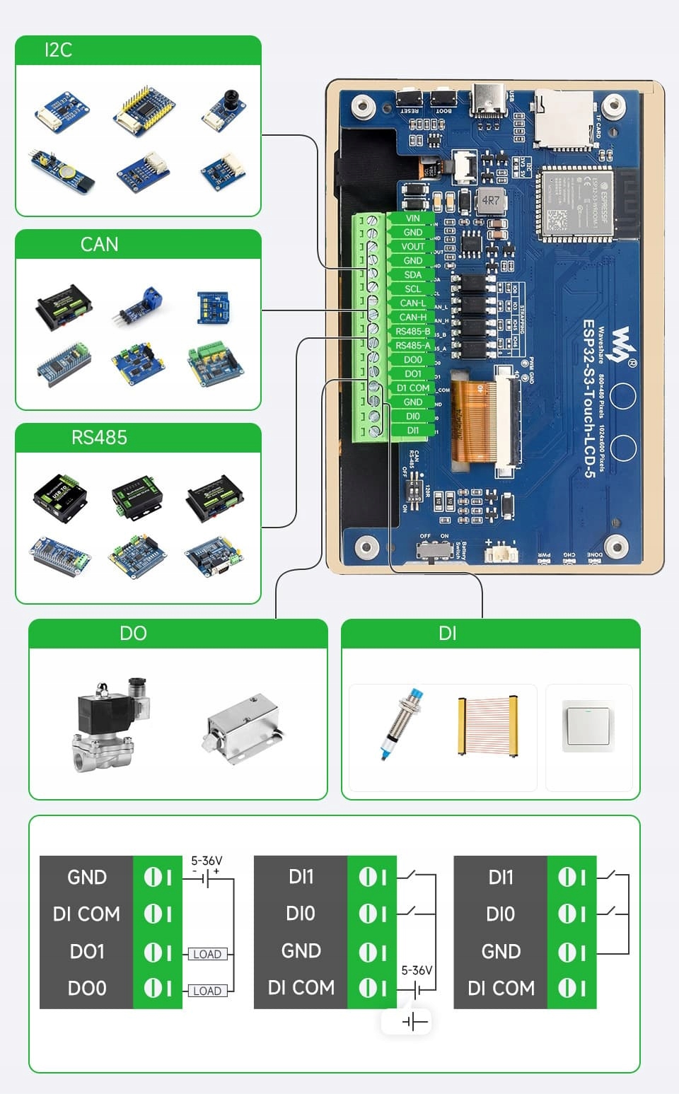 РК-дисплей 5 "800 × 480 сенсорної панелі ESP32-S3 Wi-Fi та BT CAN RS485