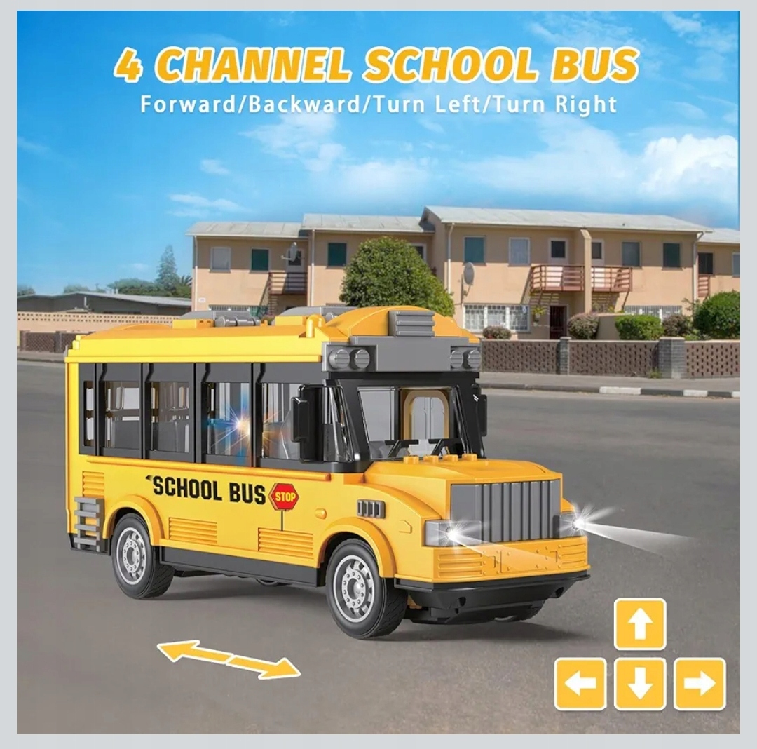 🚍 Відчуйте справжню міську пригоду! Цей шкільний автобус з дистанційним керуванням - мрія кожного маленького водія. Реалістичний зовнішній вигляд, насичений жовтий колір і світлові ефекти зі звуком роблять гру схожою на справжню прогулянку по вулицях міста. Дитина керує транспортним засобом вперед, назад і вбік, навчаючись координації та терпінню в надзвичайно цікавій формі.