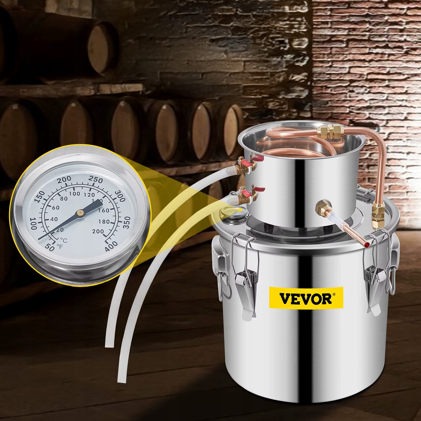 - Високоякісні матеріали: Бойлер виготовлений із міцної нержавіючої сталі, призначеної для використання. для контакту з їжею, а охолоджувальна трубка виготовлена з червоної міді найвищої якості, що забезпечує чудовий смак і аромат кінцевого продукту.