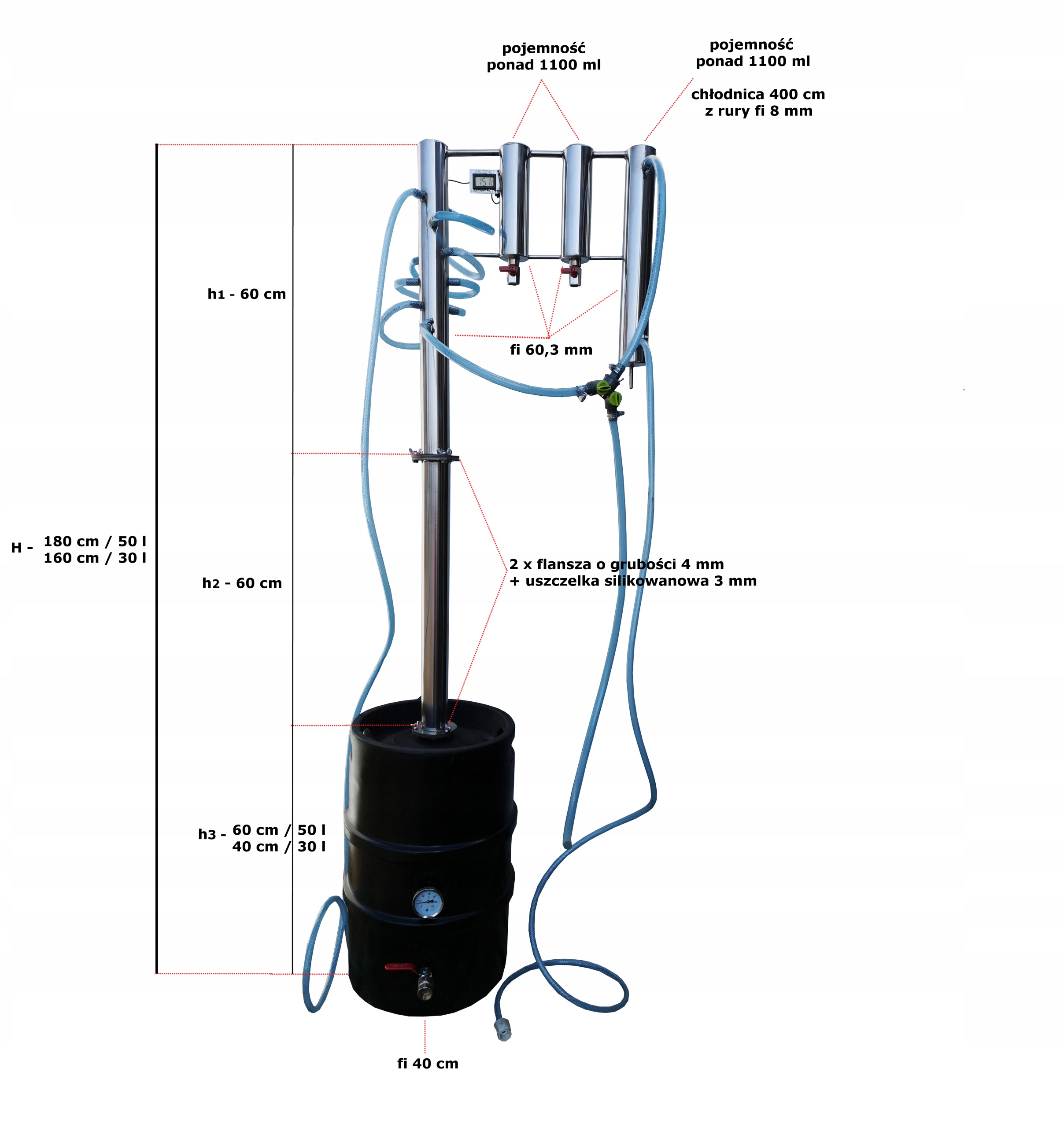 - високопродуктивний охолоджувач 1100 мл довжина 400 см з трубки fi 8, що забезпечує повне охолодження дистиляту з мінімальною витратою води. ТІЛЬКИ МИ ВИКОРИСТОВУЄМО ТАКИЙ ДОВГИЙ КОЛЕР