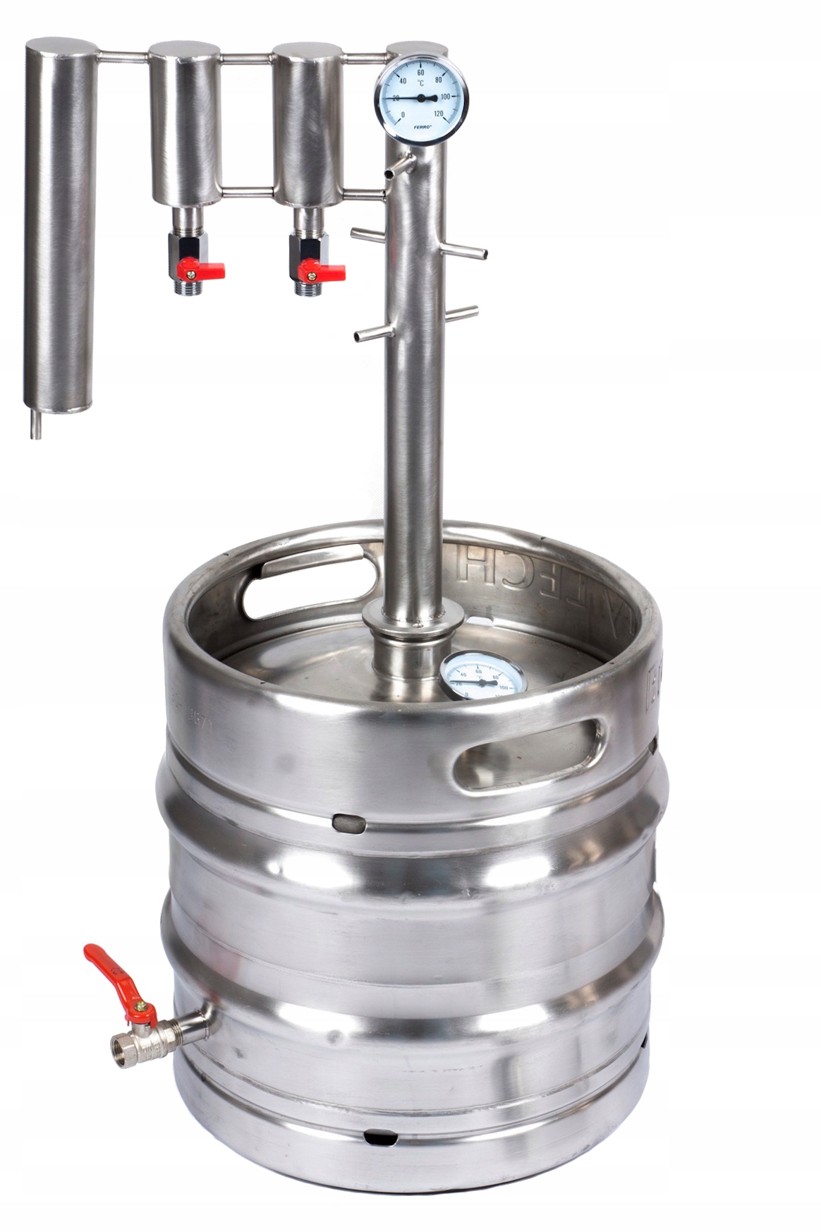 У наших дистиляторах ми використовуємо регенеровані КЕГи з кислотостійкої сталі, яка не реагує з дистильованим продуктом і дозволена для контакту з харчовими продуктами. Такі ж резервуари використовуються в гастрономії для транспортування пива.