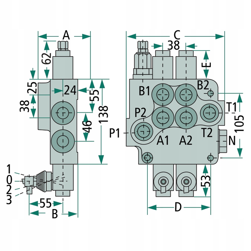 Версія: 4/3-ходовий, 2 подвійної дії, з розетками для підключення тросу Боудена