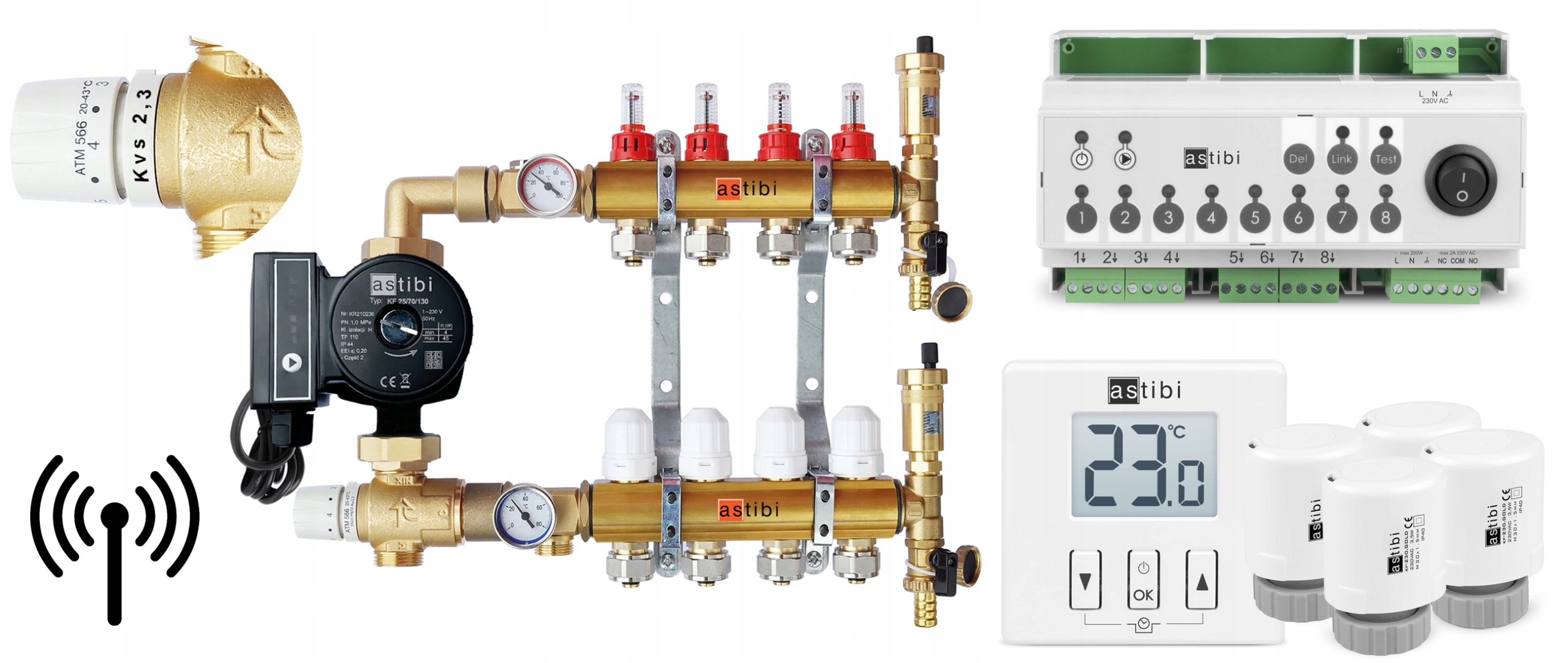 - UGP-розподілом підлоги 009 H-210 ASTIBI (включає: D16 PEX 3/4X16 Вентилятор та нерухомість) Для підлоги нагрівання ATM566 клапан ATM566 електронний електричний насос Astibi 25-60/130