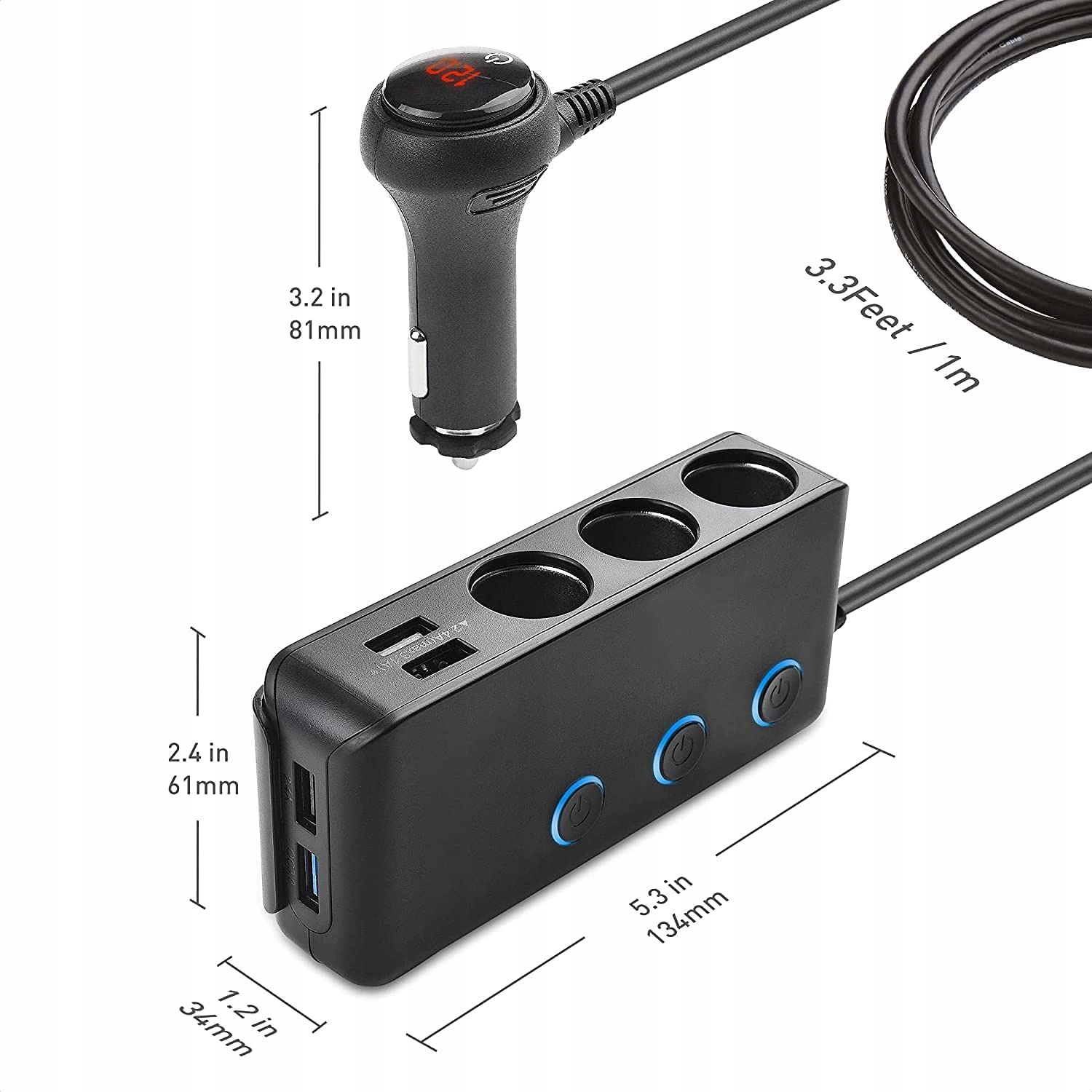 - інтегрована інтелектуальна система інтелектуально виявляє пристрій та зарядний пристрій, щоб зарядити їх з оптимальним струмом. - Розширює один легший автомобіль до трьох більш легких розетків (з незалежними комутаторами) та чотирма портами USB.