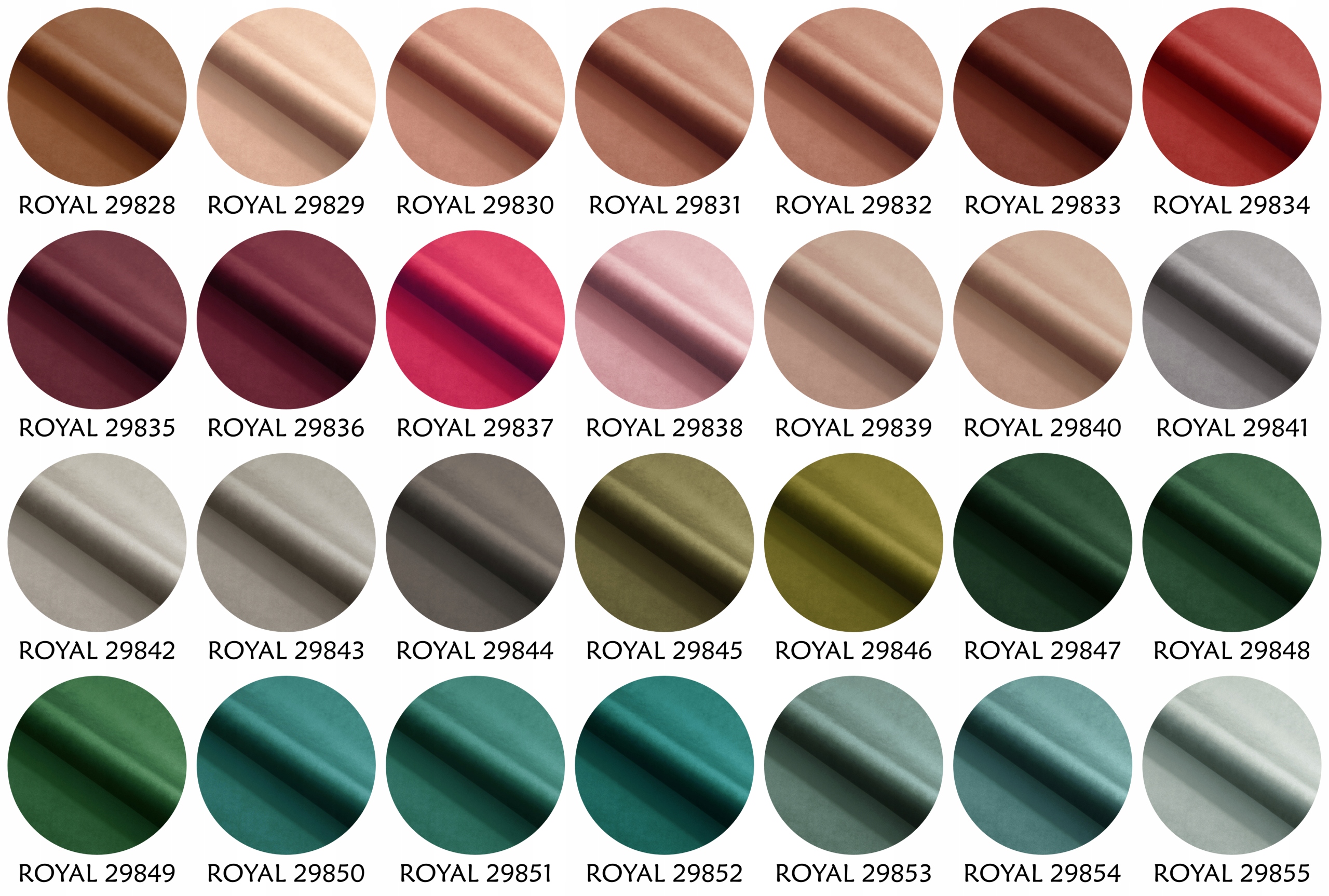 Тканина Royal Velvet — це оббивний матеріал із приємною оксамитовою поверхнею. Він має дуже хороші властивості та високі показники стирання, що підтверджує його довговічність. Royal Velvet - це плюшева тканина з щільною і приємною на дотик щетиною. Самі мікроворсинки також непомітно змінюють своє положення, коли по них проводите рукою, що додає матеріалу певний шарм у зовнішньому вигляді. Він, звичайно, дуже приємний і комфортний в контакті, тому його можна успішно використовувати як підсобне обладнання. Незважаючи на ніжність на дотик, тканина стійка до дратівливих сколів і її важко пошкодити, про що свідчить результат 100 000 у тесті на стирання Martindale, тому вона легко підходить для щоденного домашнього використання.