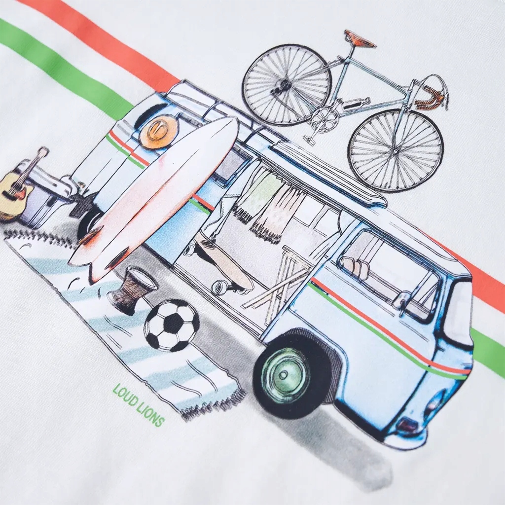 Ця дитяча футболка має короткі рукави, круглий виріз і прямий крій. Спереду прикрашений принтом автобус з додатковими елементами. Футболка виготовлена зі 100% бавовни, приємна на дотик.