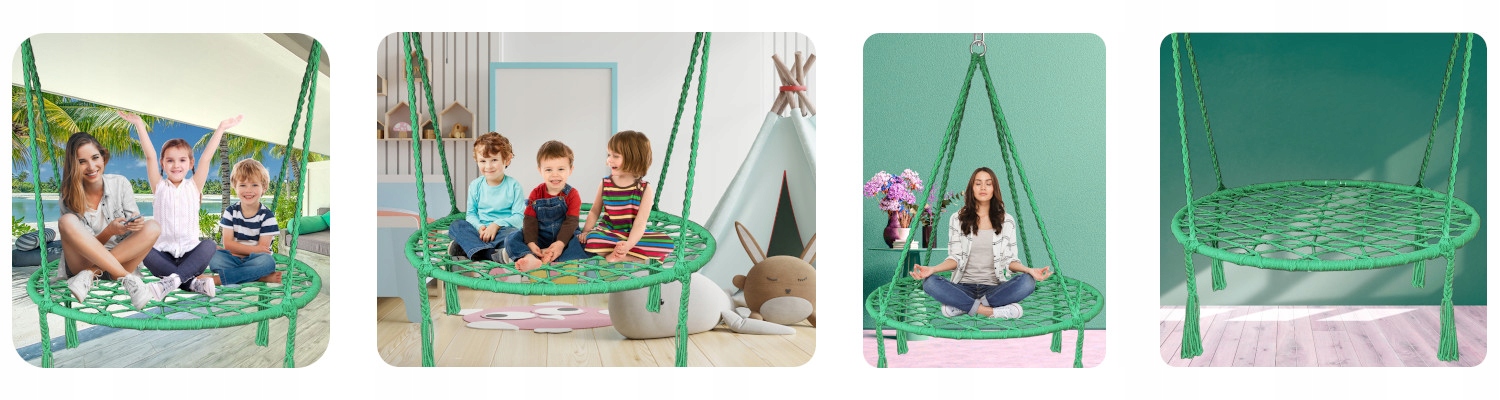 Гойдалка ідеально підійде для саду, дитячої кімнати чи вітальні. Гойдалки універсальні, їх можна прикріпити до гілки дерева в саду, до балки в садовій альтанці і до стелі на балконі або вдома.
