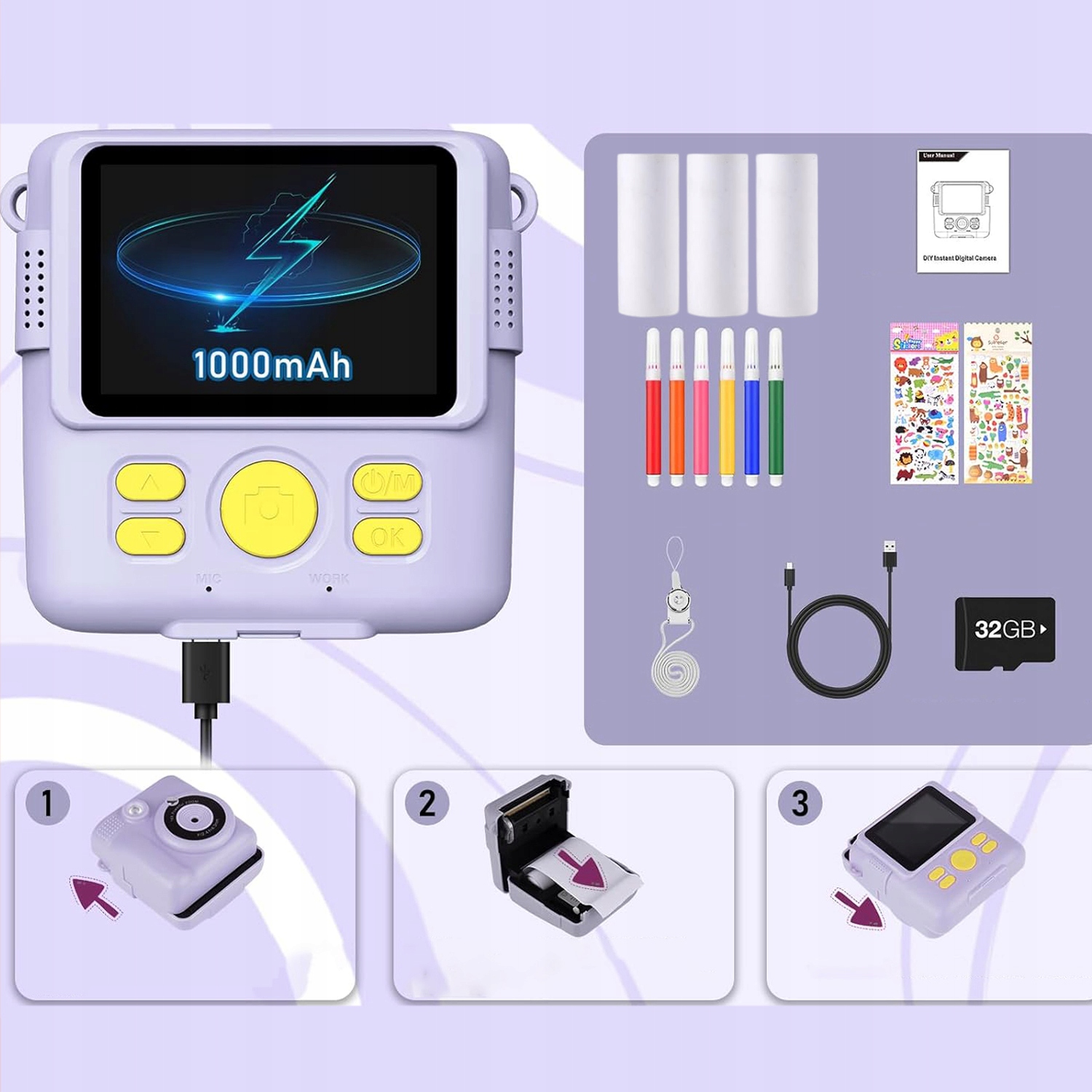 📷 【Повний комплект аксесуарів】: шнурок того ж кольору, зручний для дітей, щоб носити камеру; Картку Micro SD на 32 ГБ не потрібно купувати окремо; 6 кольорових олівців дозволяють дітям використовувати свою уяву та творчі здібності до надрукованих чорно-білих фотографій.