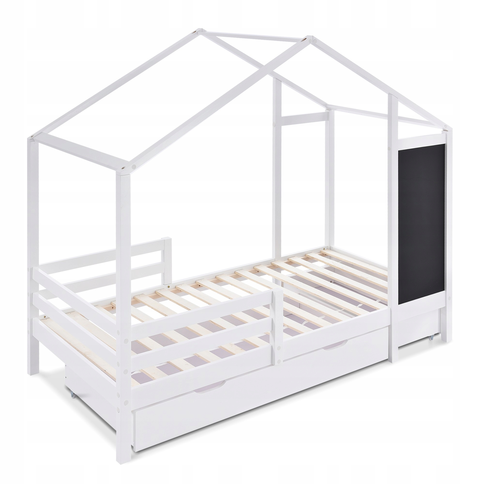Дитяче ліжко-будиночок 90 х 200 см, дерев'яне ліжко з дошкою та 2 шухлядами, масивне дерево з огорожею та рейковим каркасом, біле (без матраца)