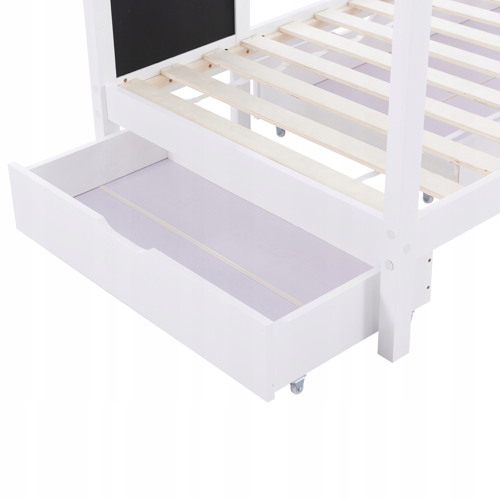 Різні функції зберігання: передня та бічна частини ліжка оснащені ящиками різної місткості. Велика передня шухляда має розміри 150x67x17 см, у ній можна зберігати великі речі, такі як ковдри або ляльки для сну для дітей. Розміри бічної шухляди 86 х 45 х 17 см, в неї можна помістити олівці для малювання.