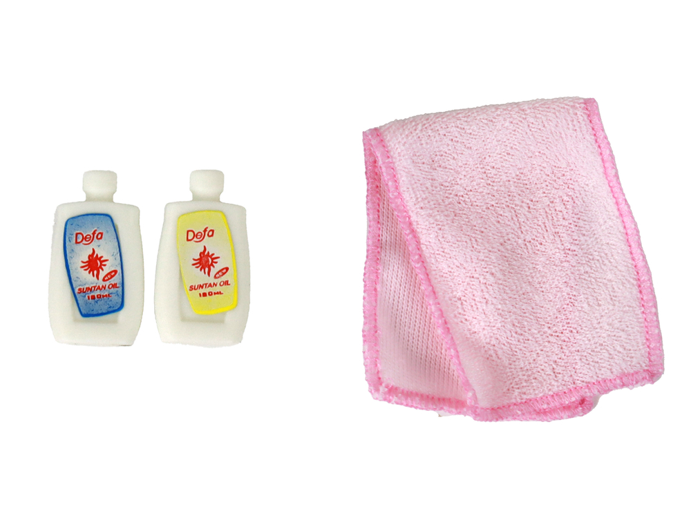 У набір входять аксесуари, які дозволяють повноцінно доглядати за лялькою. Рожевий рушник, синя гребінець, 2 олії для засмаги, джинсові шорти, блуза з короткими рукавами, біла ванна розміром 23 см x 10 см x 13 см.
