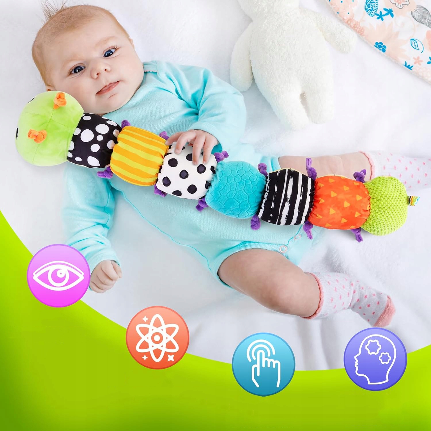 💖【Сприяє розвитку слуху та зору】 b>Плюшева іграшка може видавати 4 різні звуки: пискіт, дзвінок, мелодія, шурхіт паперу. Це може тренувати у дітей сприйняття звуків. Діти віком від 3 місяців до 3 років перебувають на стадії розвитку кольорового зору, яскраві кольори та багаті графічні візерунки сприяють їхньому зоровому розвитку.