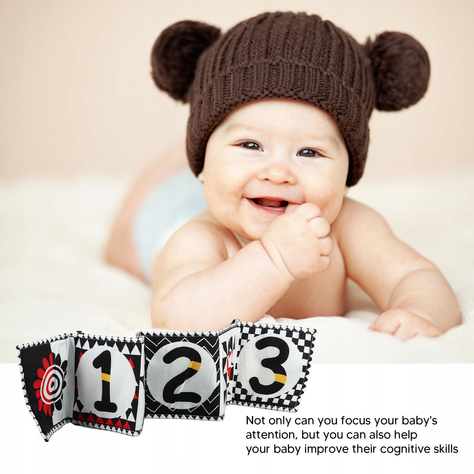 3. Різні програми: Контрастна книга для дітей дуже легка, м'яка і складена. Ви можете підключити книгу до ліжка з 4 мотузками, щоб навчити здатність дитини підняти голову або виділятися з чорної білої іграшки для новонароджених на підлозі і дозволити дитині повернути книгу пальцями, практикувати координацію рук і око дитини.