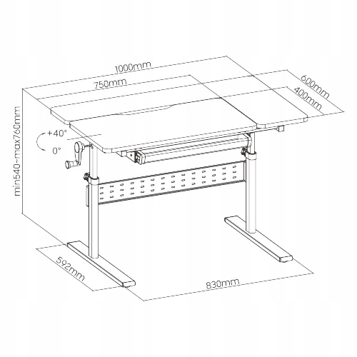 Робочий стіл, який можна нахиляти в діапазоні 0-40 градусів, дозволяє досягти ергономічних кутів для читання, письма та малювання. Завдяки такій конструкції стіл може забезпечувати зручне робоче положення та допомагає уникнути болю в шиї та хребті. Після налаштування нахилу затягніть фіксуючу ручку, щоб переконатися, що стіл залишається в поточному положенні.