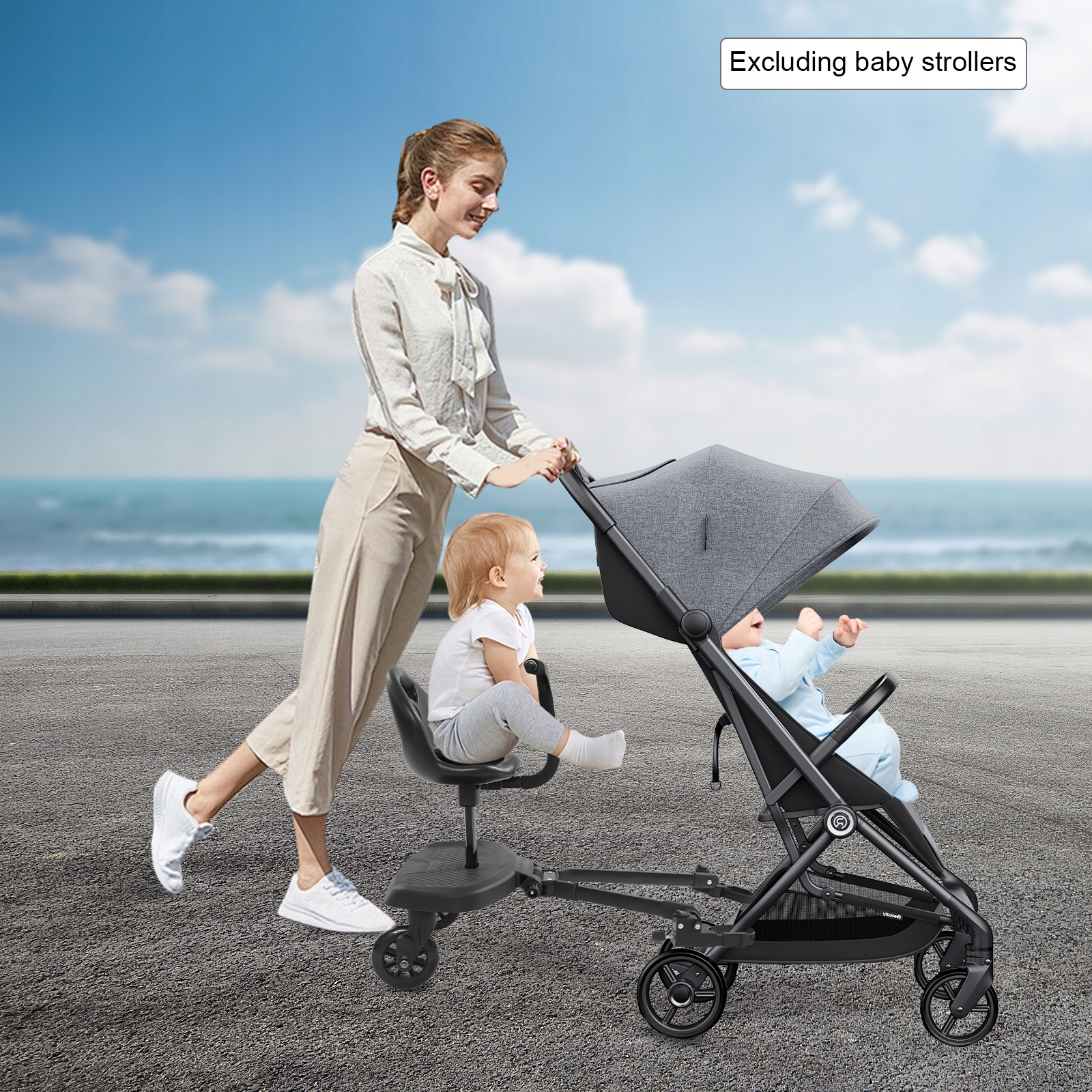- Універсальність у двох режимах: його конструкція 2-в-1 включає в себе знімне сидіння, яке дозволяє дітям зручно стояти або сидіти під час подорожі, додаючи при цьому практичну зручність. Якщо він не потрібен, просто повісьте його на ручку коляски за допомогою міцного ремінця, що входить у комплект, і стане компактним інструментом, зручним для подорожей.