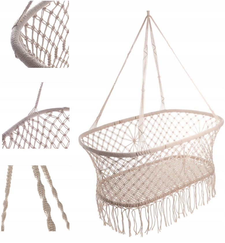 Виготовлена з бавовняної нитки, підвісна колиска в стилі БОХО ідеально впишеться в будь-який інтер'єр як альтернатива великим, важкі дитячі ліжечка, які займають багато місця.