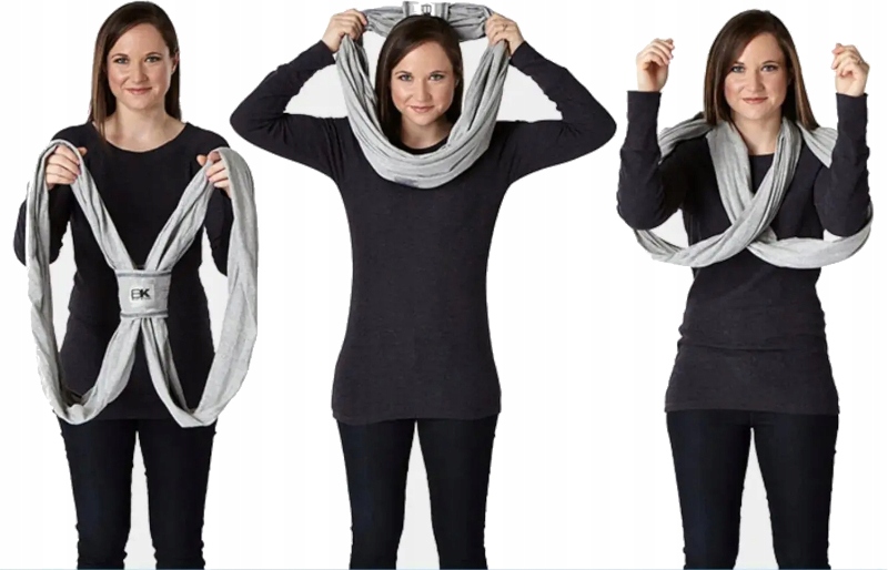 Шарф BABY K'TAN виготовлено з запатентованою подвійною петлею. Дві великі петлі з’єднані третьою меншою петлею, а також використовується панель із тканини у певних положеннях, щоб тримати дитину ближче одне до одного.