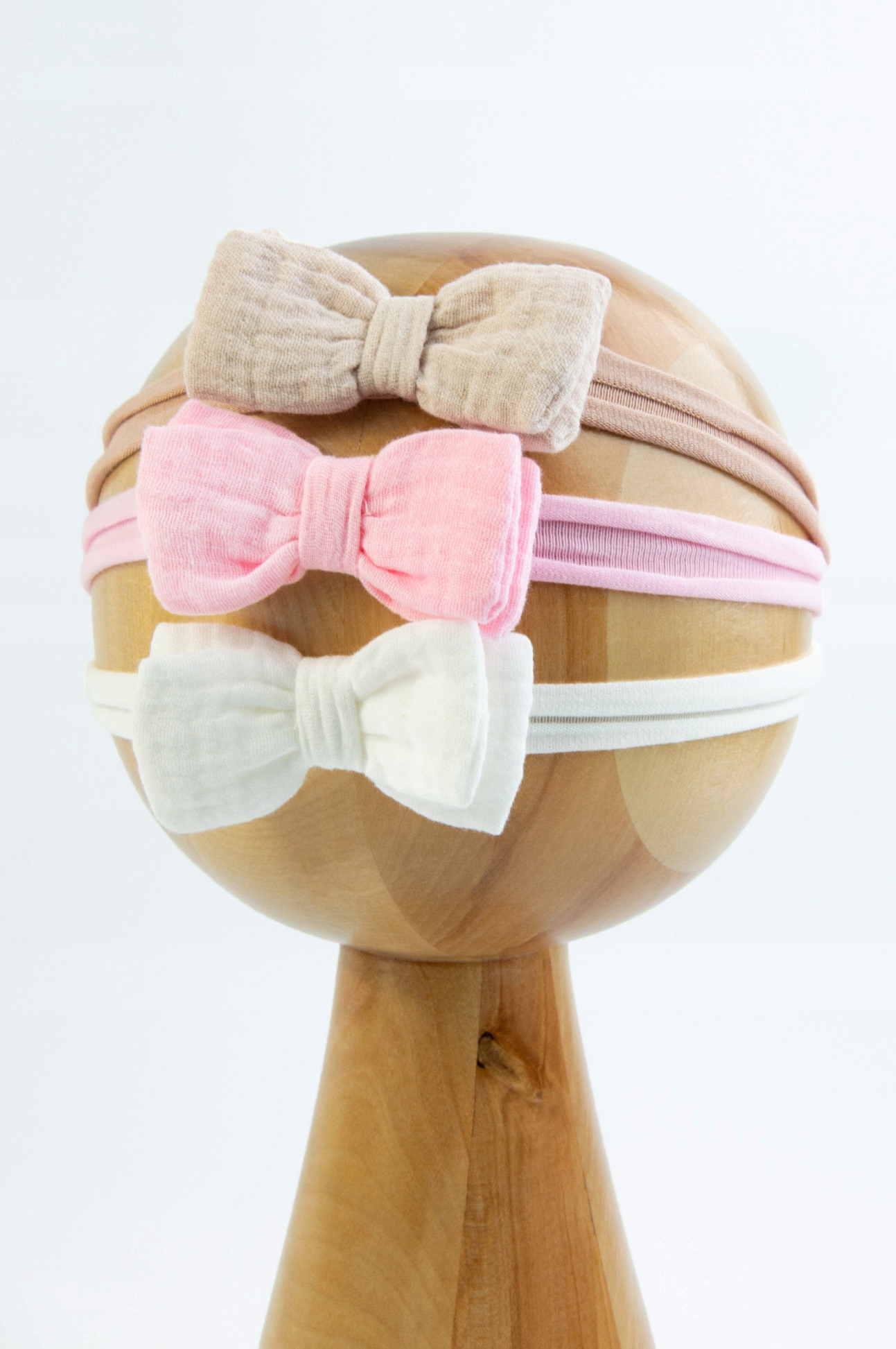 Цілком натуральний, делікатний і без тиску пов'язка для немовлят з бежевим бантом.