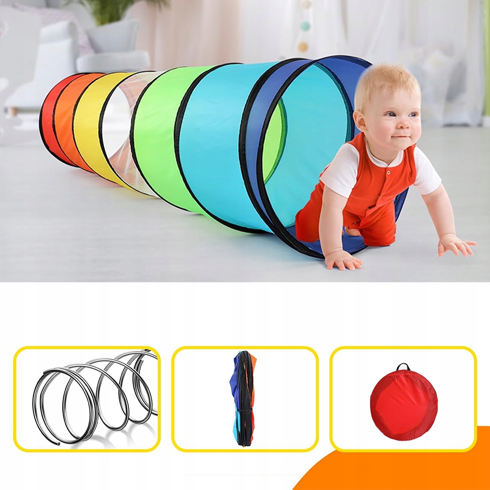 Цей повзучий тунель для дітей має унікальний барвистий дизайн, який дозволяє швидко відкрити його й не втрачати жодної миті гри вашої дитини. Пружинна сталева конструкція дозволяє тунелю складатися, коли він не використовується, що дозволяє легко носити його в сумці. Це ідеальний вибір для ігор на свіжому повітрі.