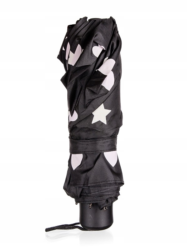 Складна дитяча парасолька - дуже практичний і корисний гаджет. Він не займає багато місця, тому його можна покласти в рюкзак або сумку. Додаткова перевага, яка порадує наймолодших - цікавий принт, який змінює колір при контакті з дощем. Парасолька чорного кольору з білим принтом із сердечками та зірочками.
