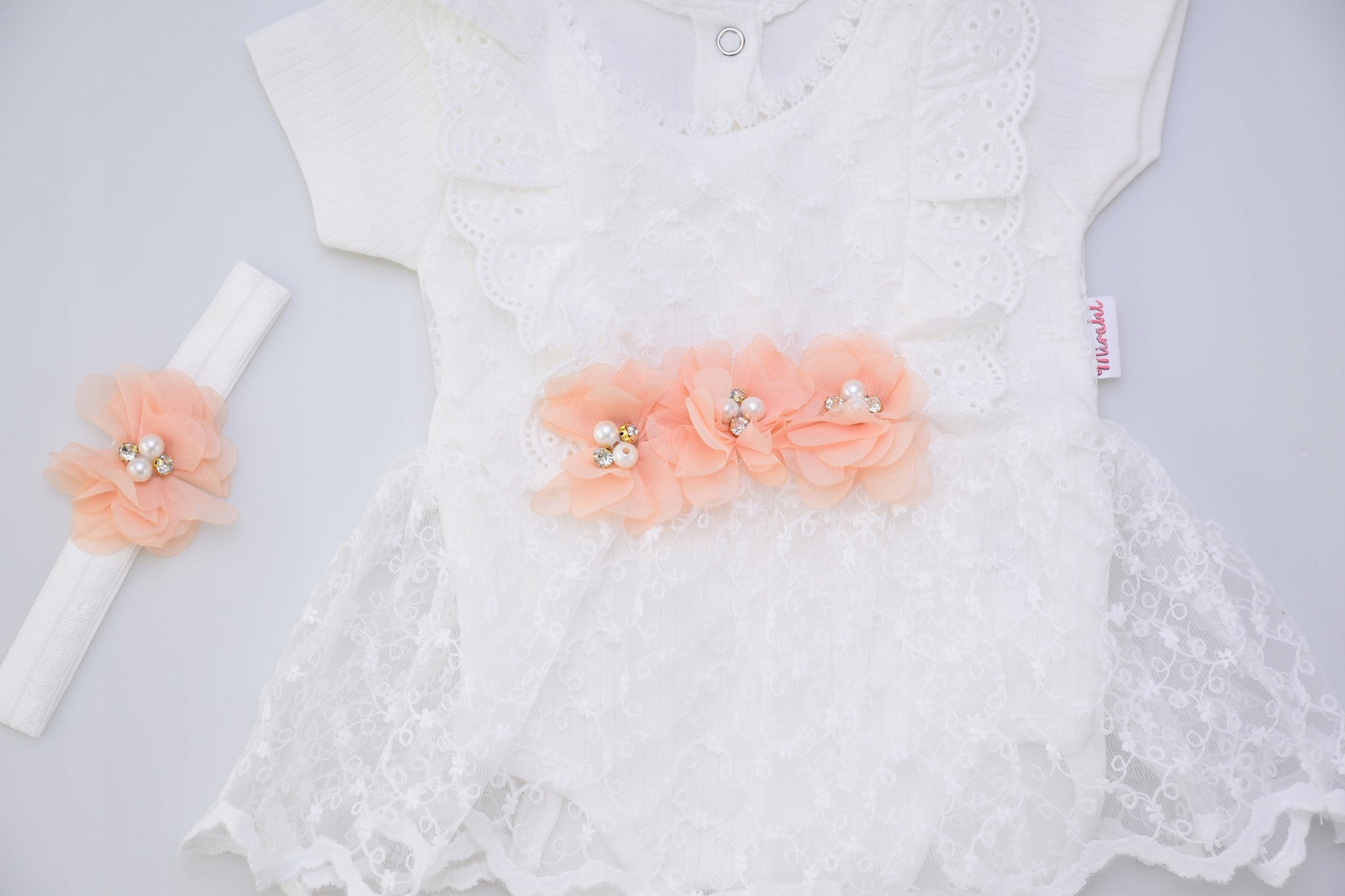 Біла сукня на голу ногу застібається на застібки на спині. Короткий рукав. Сукня має білі декоративні, вишиті волани. Декоративне мереживо на шию. Спідниця-кльош із фатину, вишита білим квітковим візерунком. На талії кріпляться три декоративні квітки персика. Прикраса знімна. У комплект входить біла еластична пов'язка на голову з квіткою персика та намистинами.
