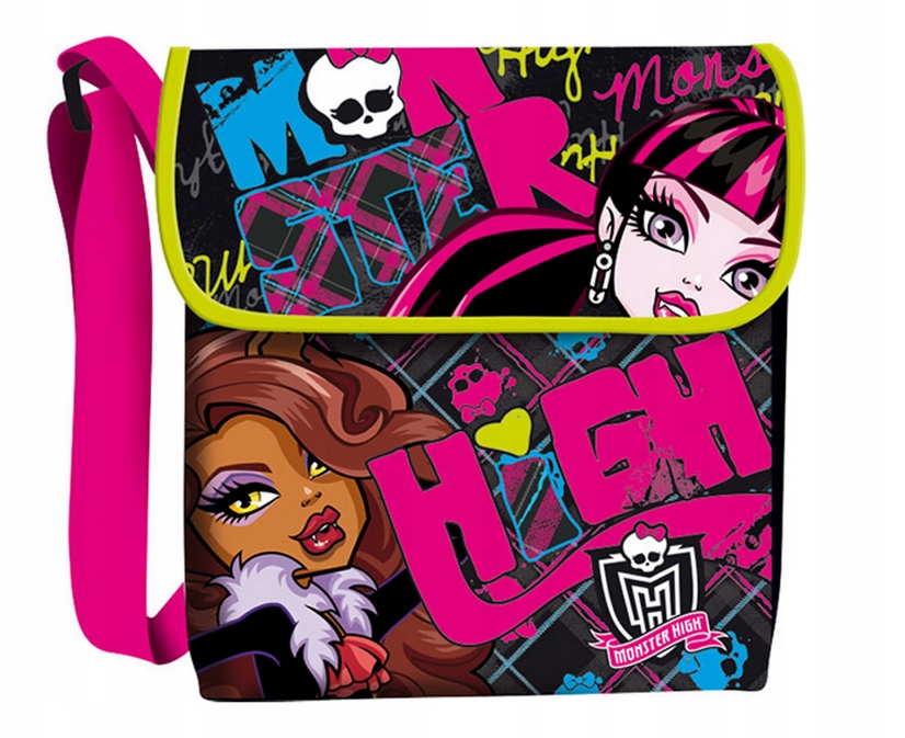 Сумочка Monster High, ідеально підходить для носіння на плечі для різних випадків. На гаманці ми знайдемо зображення ляльок Monster High: Clawdeen Wolf і Дракулаура. Вся сумка чорна з зеленими кінчиками. Це має також регульований рожевий ремінь. Сумка однокамерна закрита Липучки.