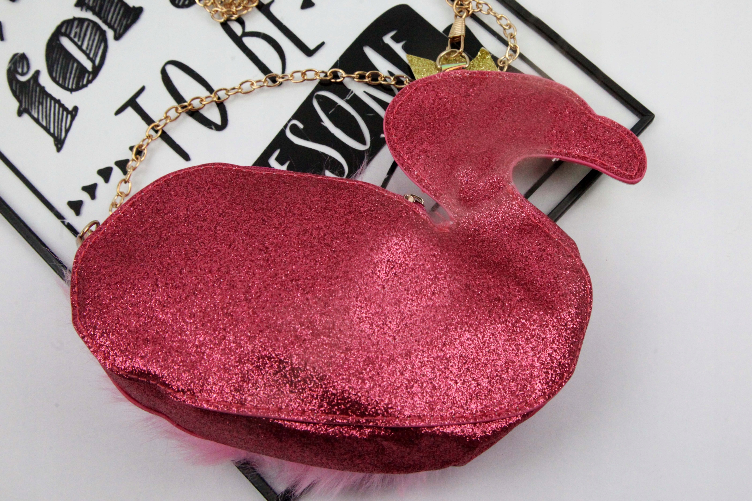Красива та оригінальна полум'яна сумка на золотих ланцюгу. Тулуб птаха з одного боку, виготовлений з м'якого хутра. Інші елементи, тобто Голова Фламінга та корона виготовлені з еко -ланцюга, покритого блиском. Диво! Ми рекомендуємо для маленьких принцес;)