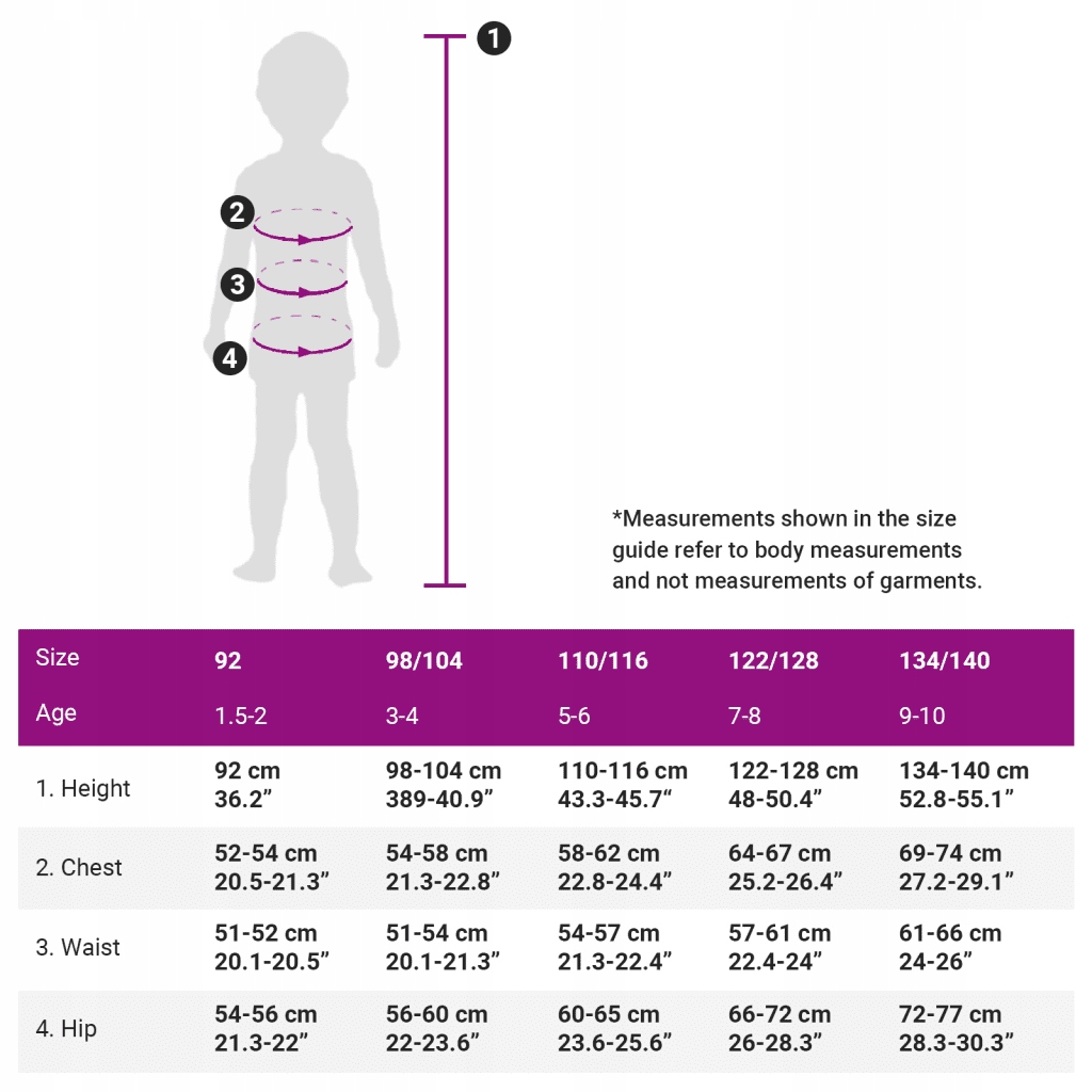 Варто знати: Таблиця розмірів на фотографії містить розміри для дітей від 1,5 до 10 років, що охоплює ріст, груди, талію та стегна. Завдяки цьому ви можете легко знайти розмір, придатний для вашої дитини.