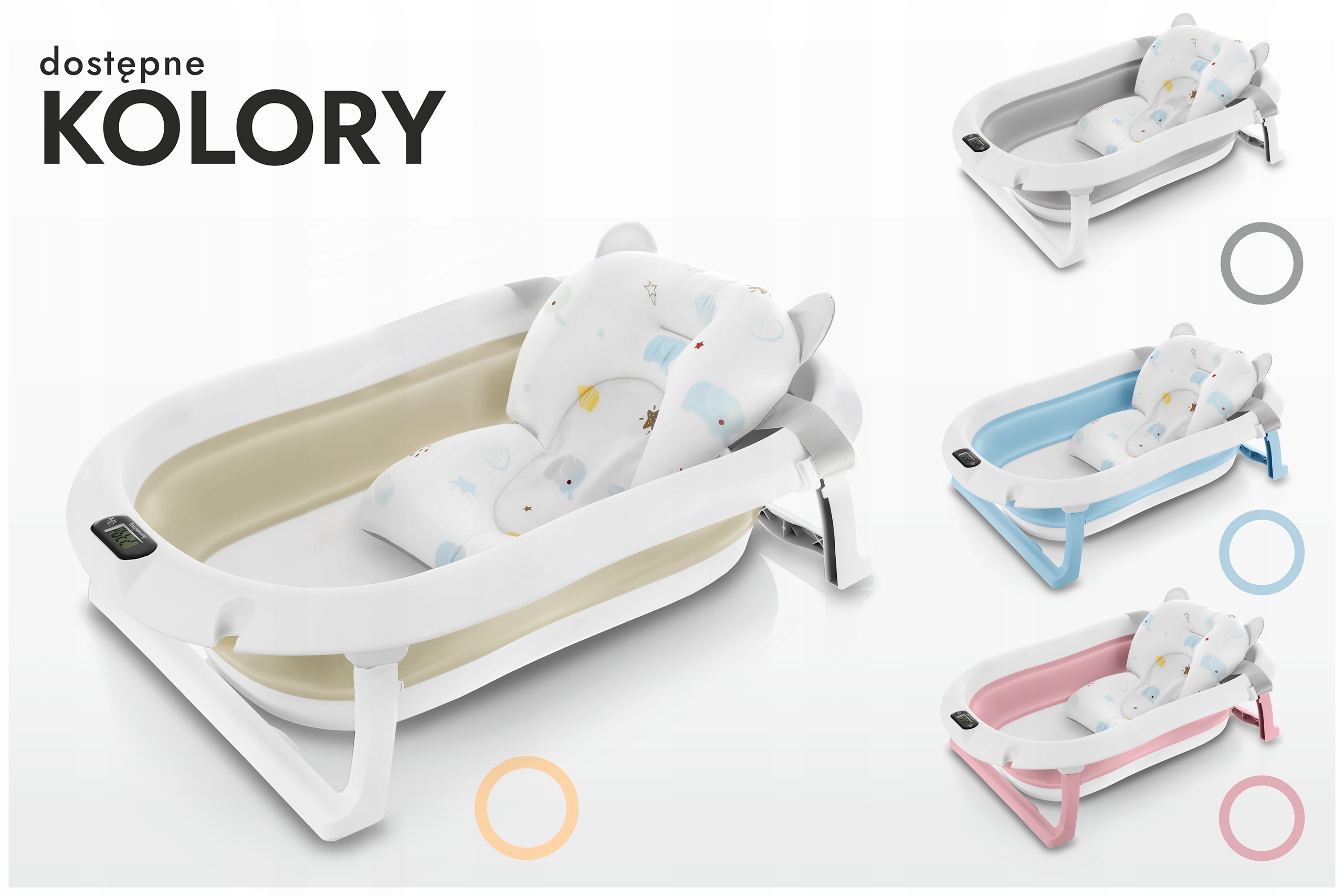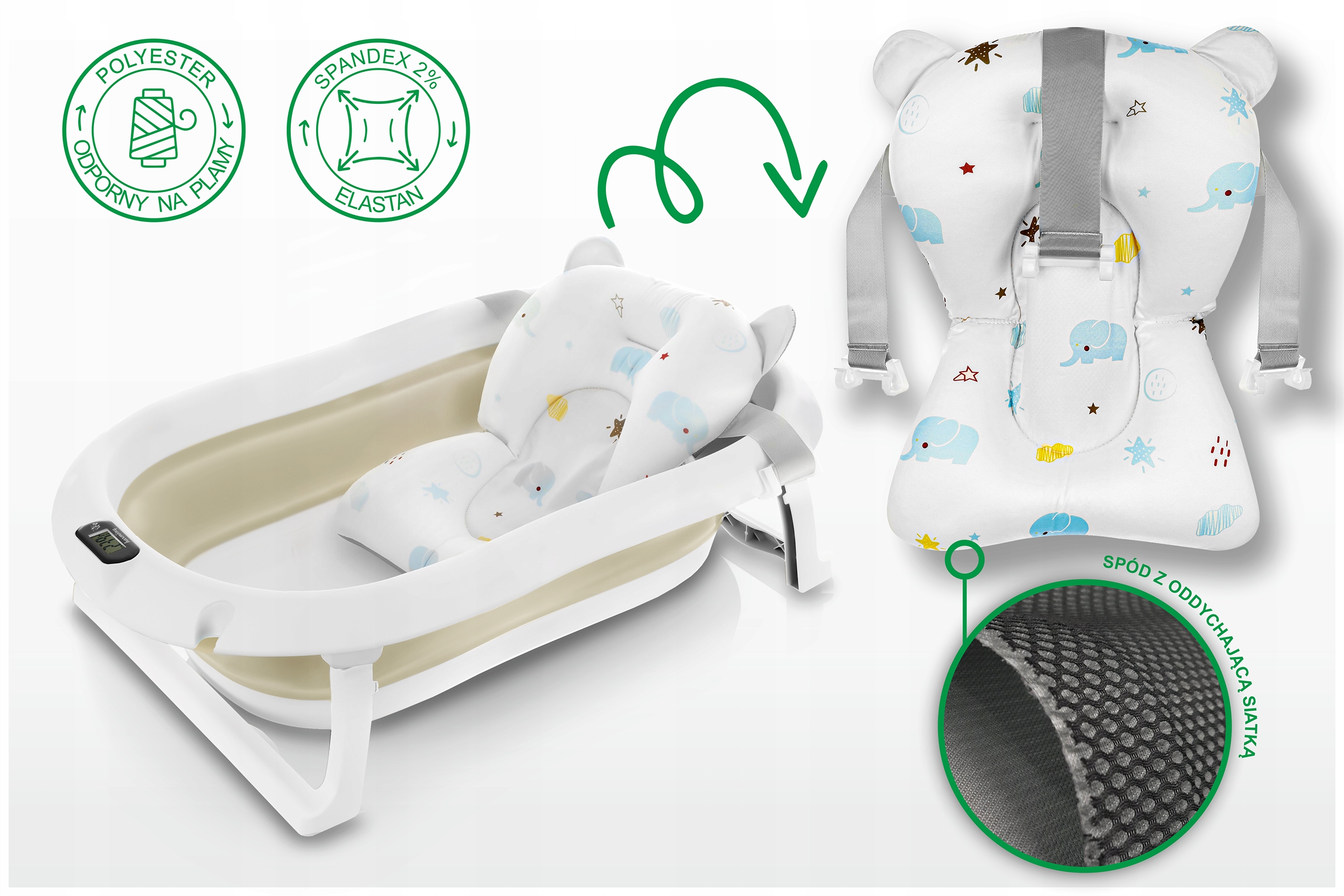 Ванна була розроблена для щоденного комфорту батьків. Завдяки розкладному дизайну ви можете легко зберігати його в гардеробі або взяти його з собою в подорож. Вбудований термометр дозволяє стежити за температурою води, що впевнено, що дитина буде купатися в зручних умовах (перед тим, як покласти дитину у воду, завжди переконайтеся, що його температура правильна!). Додаткова подушка, встановлена на ременях, дозволяє ванни новонароджених, стабілізуючи її положення.