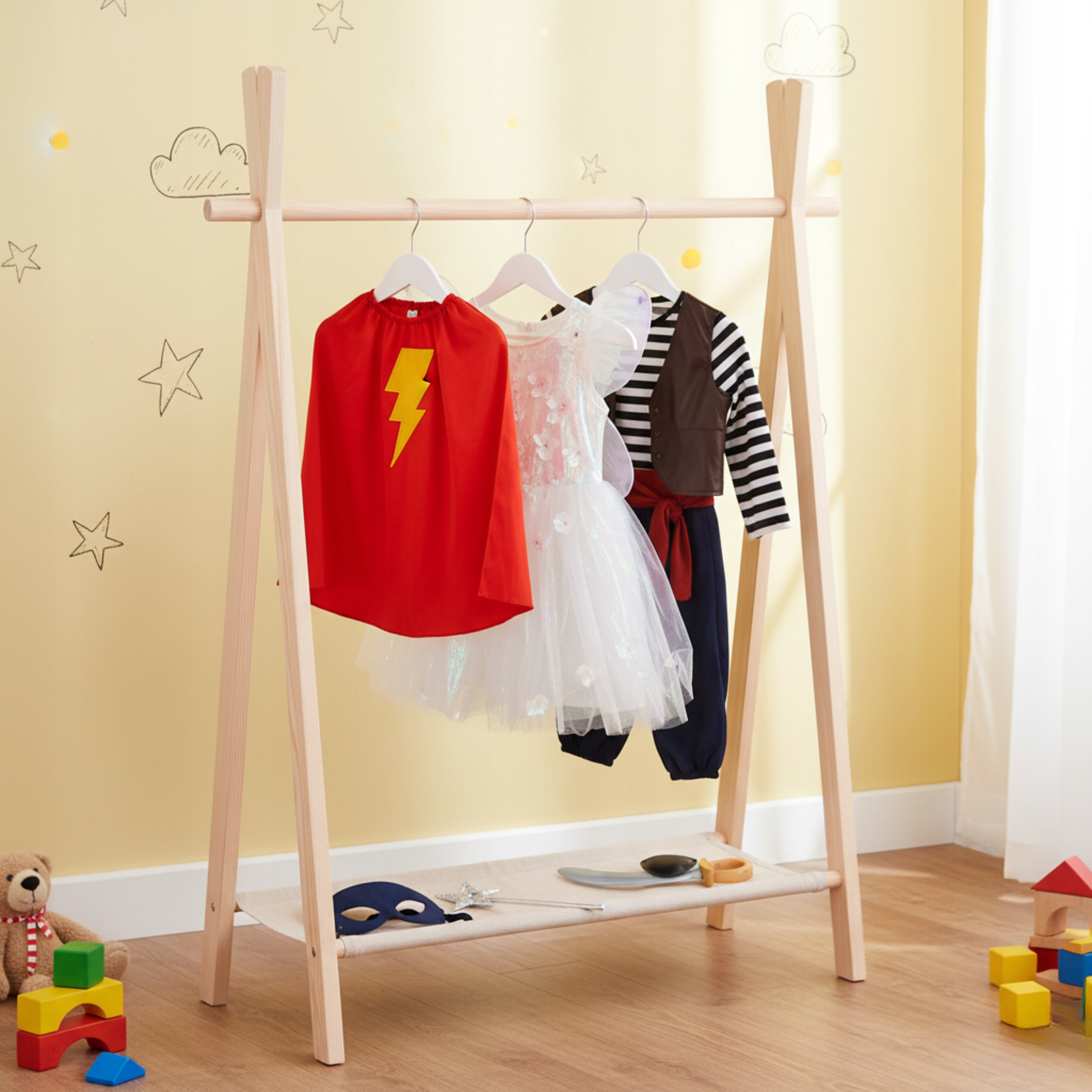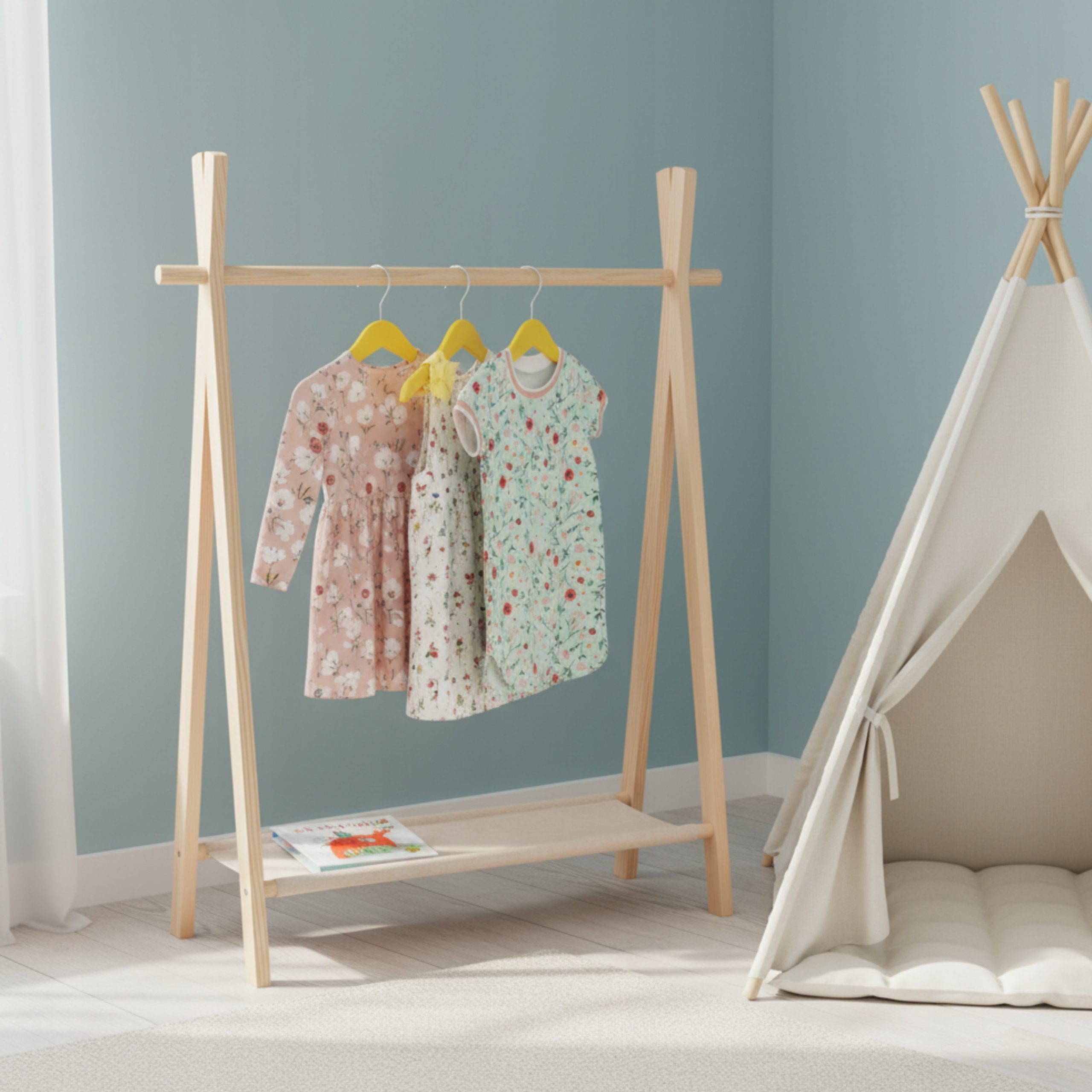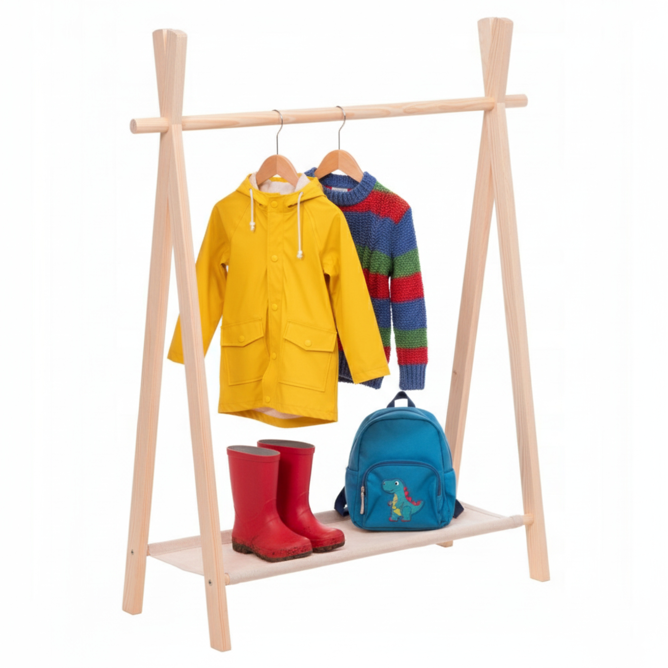 Перша справжня шафа для Вашої дитини. Ця чарівна дерев'яна вішалка для одягу є ідеальним рішенням для дитячої кімнати, поєднуючи мінімалістичний дизайн з надзвичайною функціональністю. Він створений, щоб заохочувати найменших вчитися самостійності та піклуватися про власні речі.