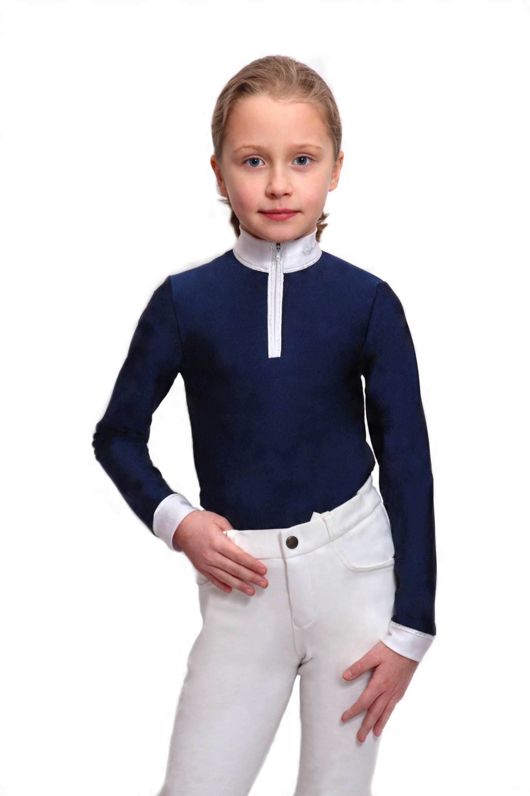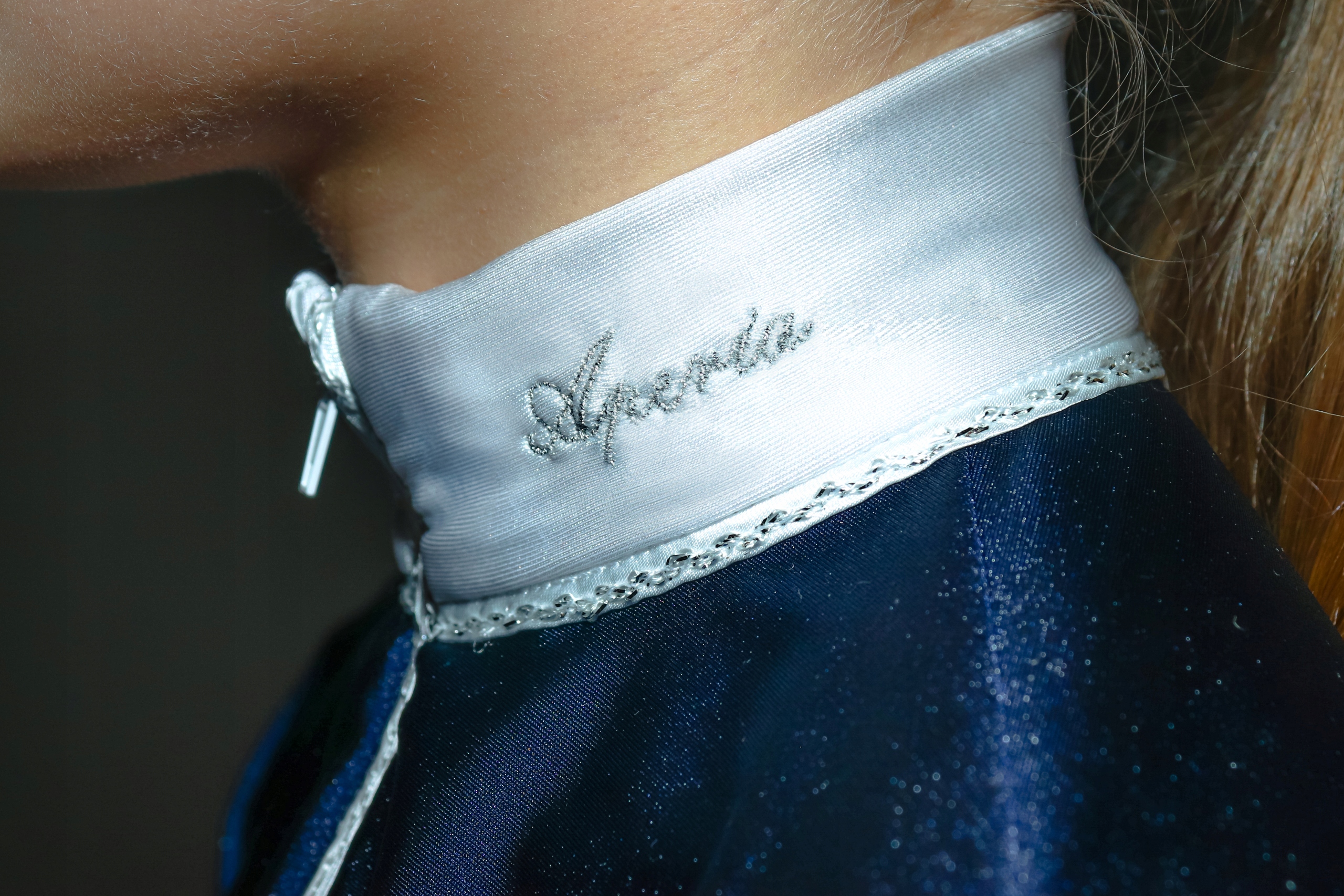 Надзвичайно елегантна змагальна сорочка темно-синього кольору. Виготовлений з тканини найвищої якості, яка чудово відводить вологу. Оздоблений срібною окантовкою, спереду застібається на блискавку. Ніжна вишивка з фірмовим логотипом на комірі-стійці.