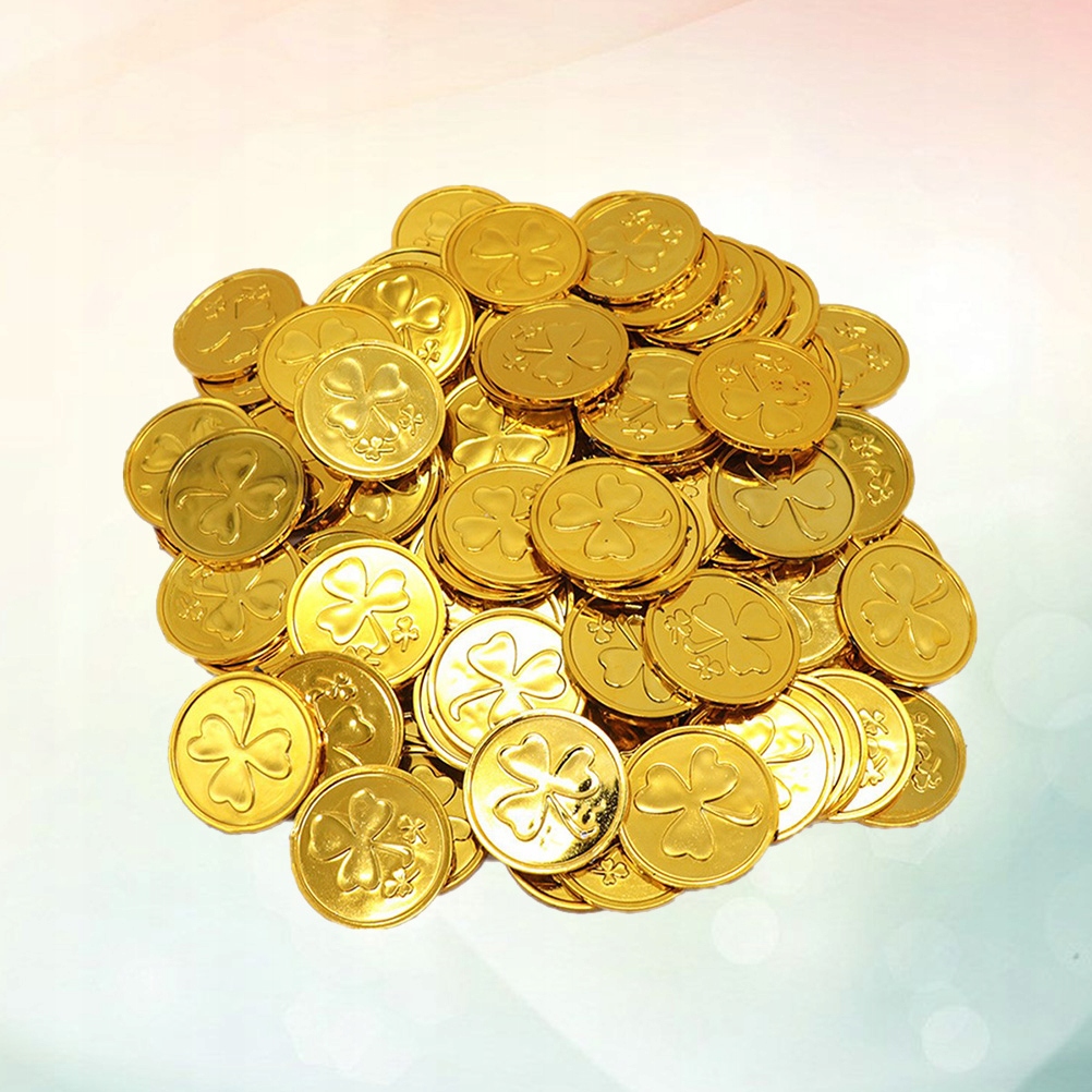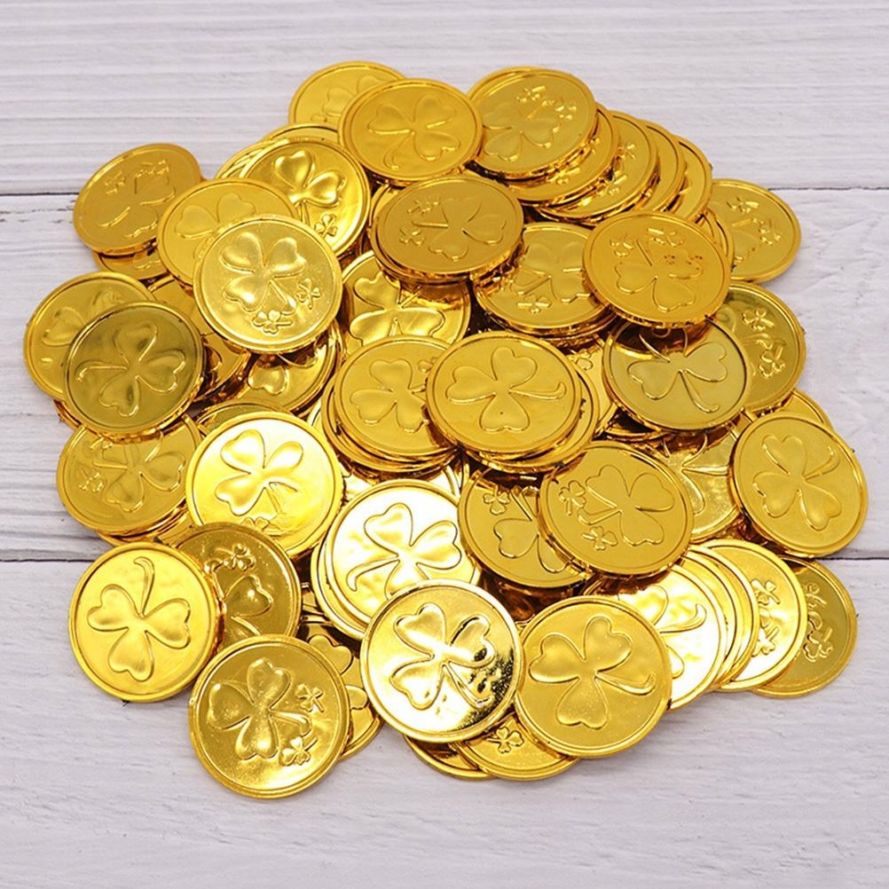 ✅Це набір іграшок для дітей. Містить 100 пластикових золотих монет із покриттям. На монеті нанесено красивий малюнок конюшини. Ідеально підходить для сценічного реквізиту, центрального декору, вечірки, Хелловіну, скрині зі скарбами, коштовностей.