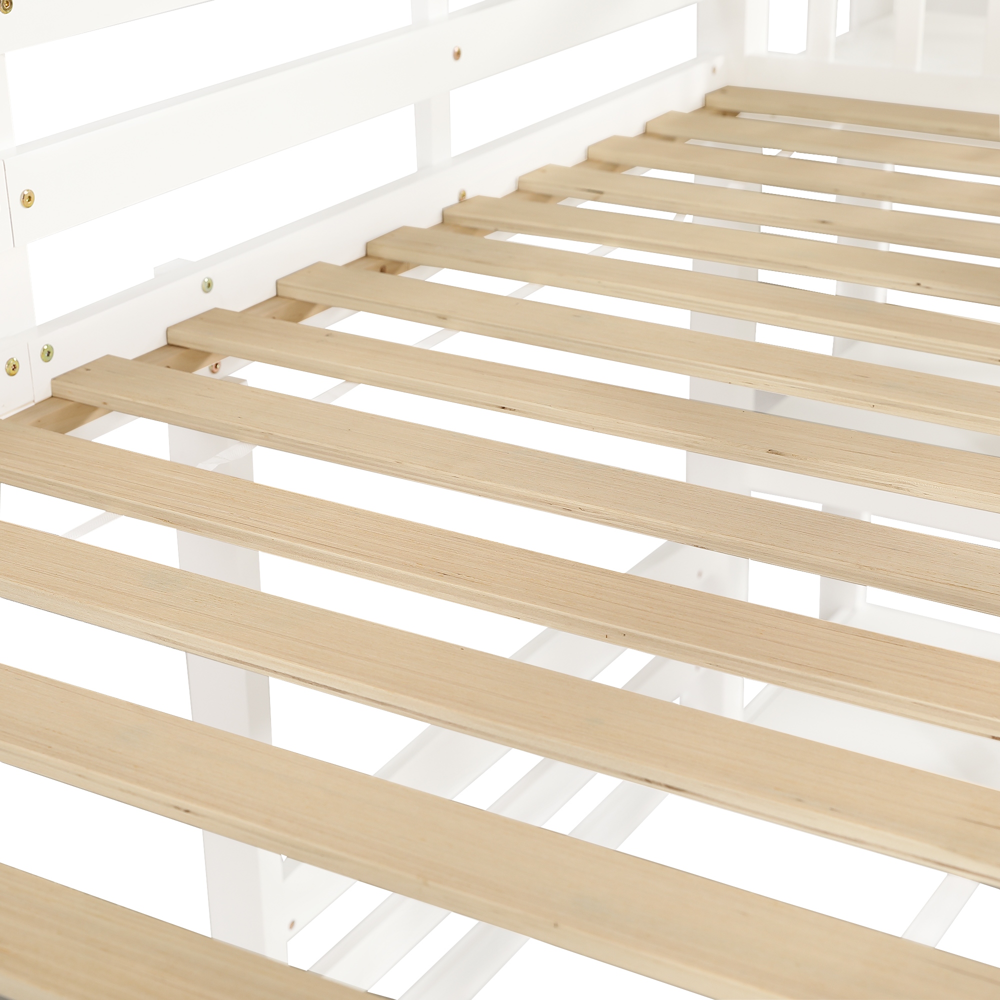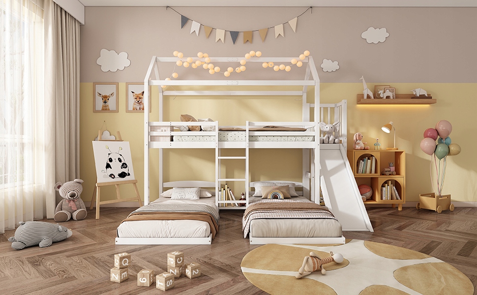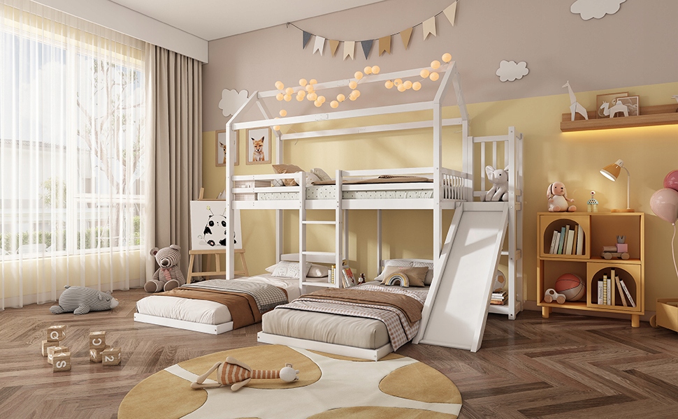 Двох’ярусне ліжко, дитяче ліжко, міцна каркасна конструкція ліжка, з гіркою, унікальна конструкція даху, тримісна, місце для зберігання на верхньому ліжку, сосна + МДФ, білий, 90 х 200 см