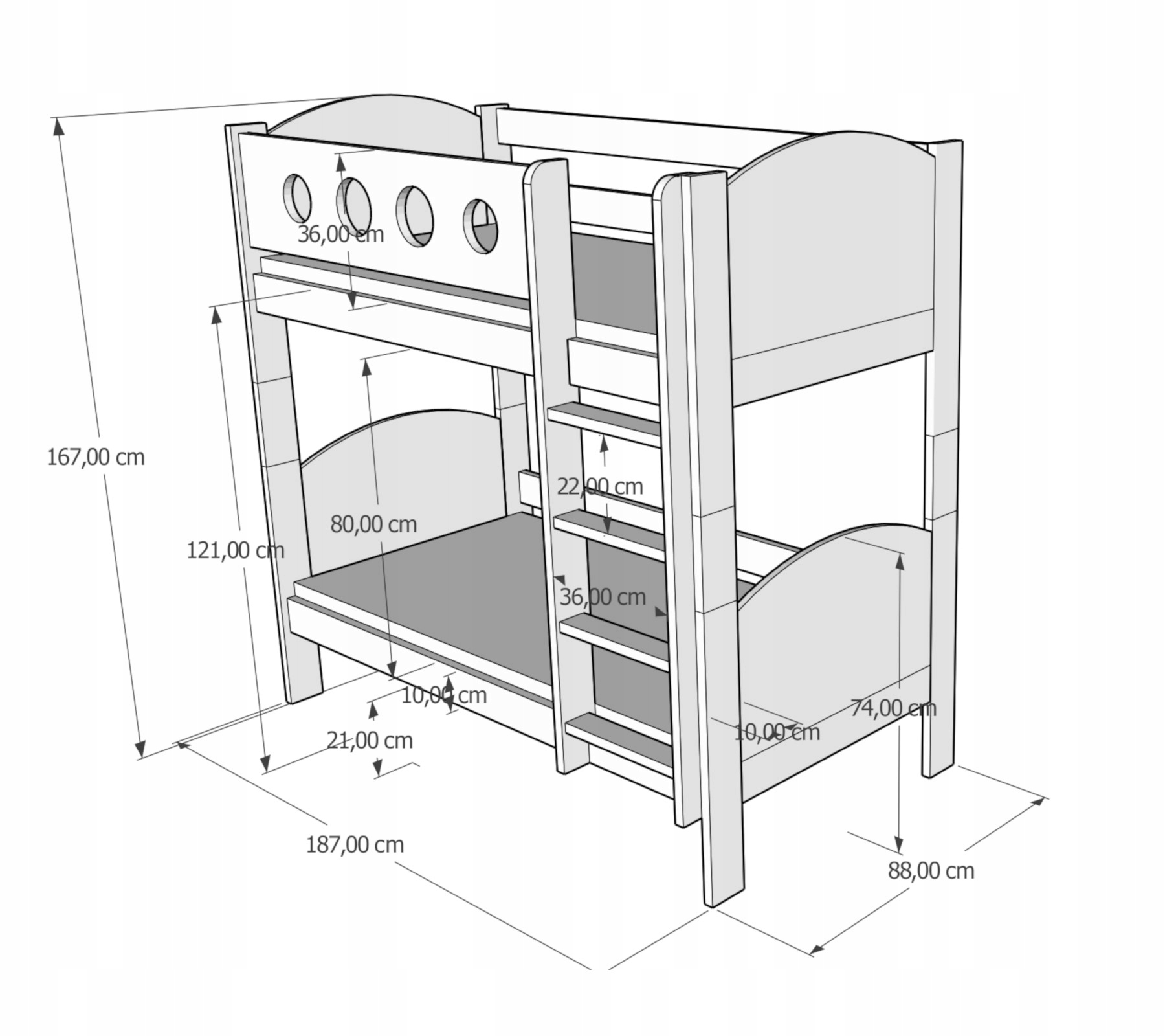 URWISEK L - двоярусне ліжко, яке можна розділити на два окремих ліжка. Виготовлена з високоякісної деревини сосни в поєднанні з міцною меблевою дошкою в підголовниках і верхніх рейлінгах. Заокруглені краї гарантують комфорт використання, а плоскі щаблі драбини зручні та безпечні для дітей. Характерною особливістю цієї моделі є прості гладкі підголівники та верхня бічна планка, прикрашена вирізаними колами.