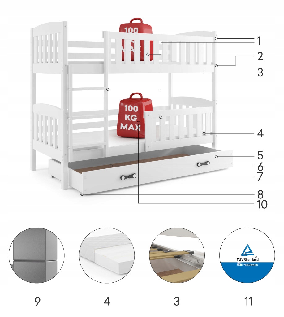 - Матраци: розміри 190х80 + чохол (стьобана гіпоалергенна тканина з поліестеру + кондиціонер + пінополіуретан + блискавка).