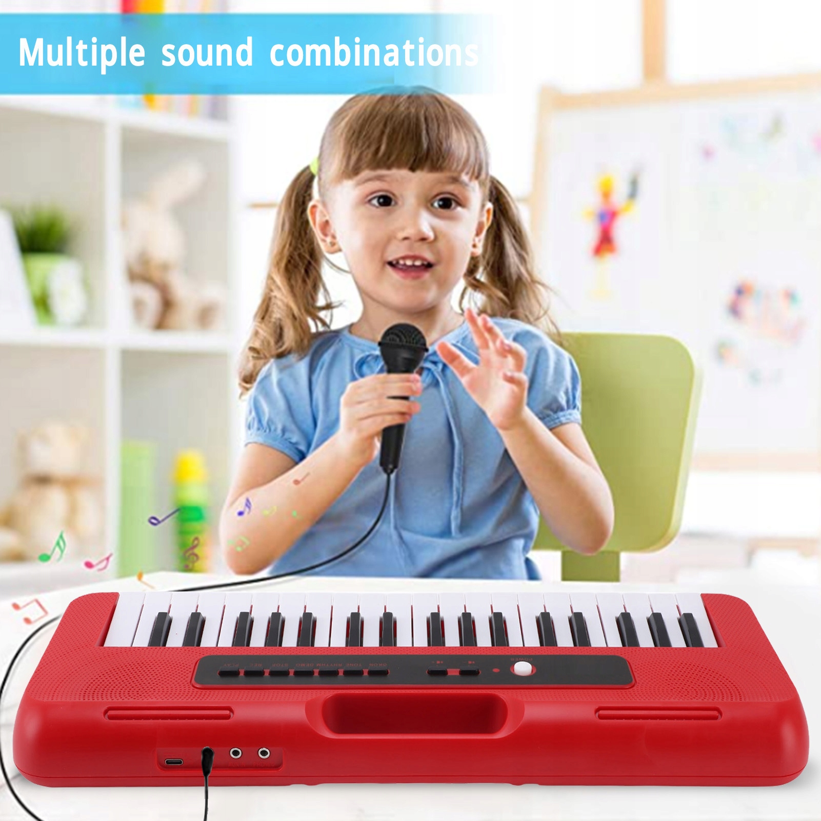 Функція:1. Багатофункціональна клавіатура: клавіатура містить 37 клавіш, що відповідають унікальній ноті, 4 тону, 4 ритми та 10 демонстраційних пісень. Він також підтримує такі функції, як запис, зупинка, відтворення та регулювання гучності, додаючи глибини для дітей.