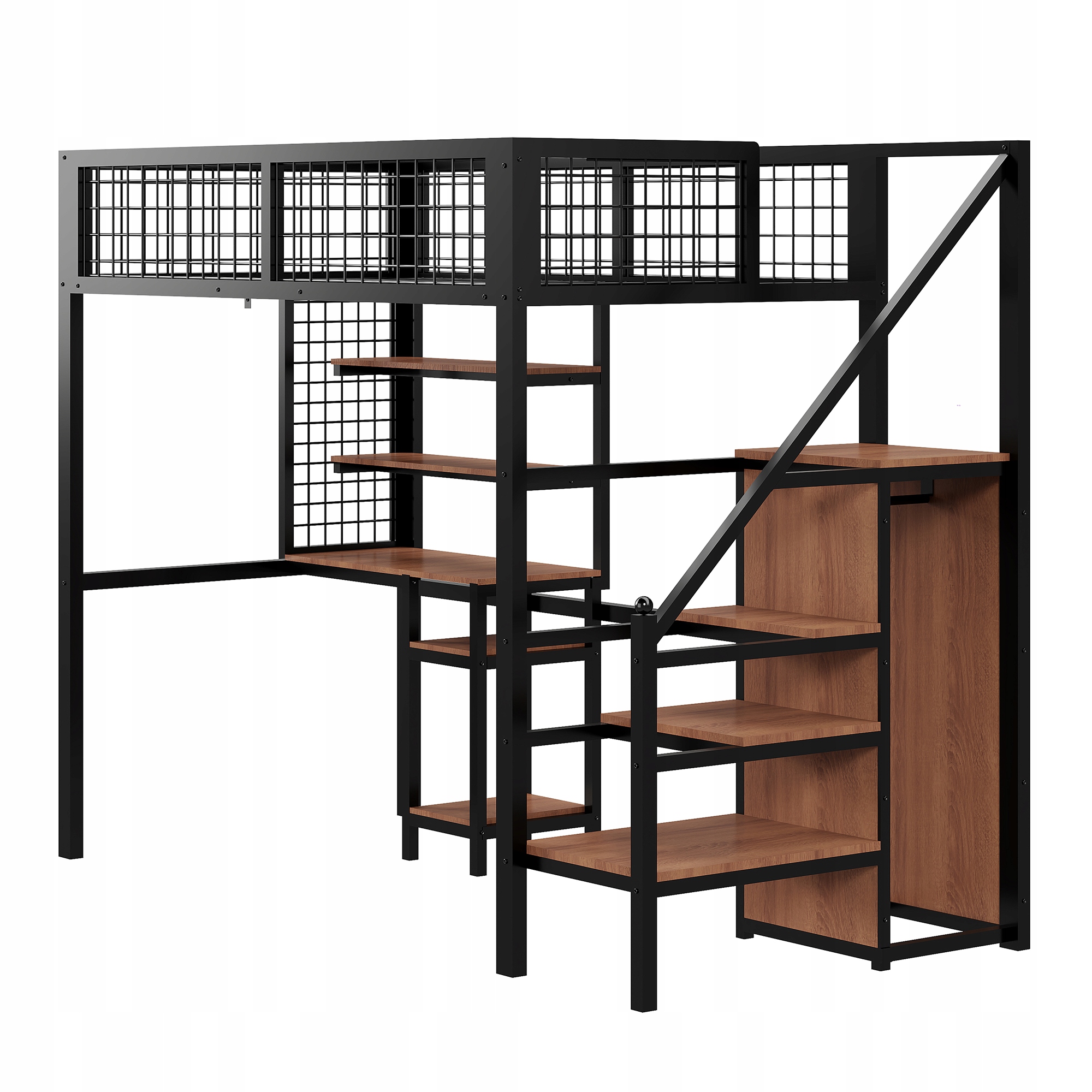 Ліжко-горище 90x200 з безпечною драбиною, дитяче ліжко з шафою на металевому каркасі та чорний комп’ютерний стіл