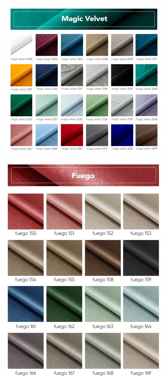 FUEGO - це плюшева оббивка тканина, що характеризується ледь помітною м'якістю на дотик. Це також тканина з групи вогнестійких тканин. Вона також має антибактеріальний сертифікат. Однак найбільшою перевагою цієї оббивної тканини є обмежене поглинання рідини, що полегшує чистити.