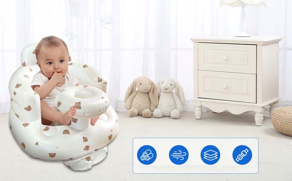 Це крісло-надув підходить для немовлят віком від 3 до 36 місяців і може використовуватися як вдома, так і на вулиці, наприклад у ванних кімнатах, спальнях, вітальнях, на пляжах і газонах. Ідеально підходить для купання, ігор і годування.