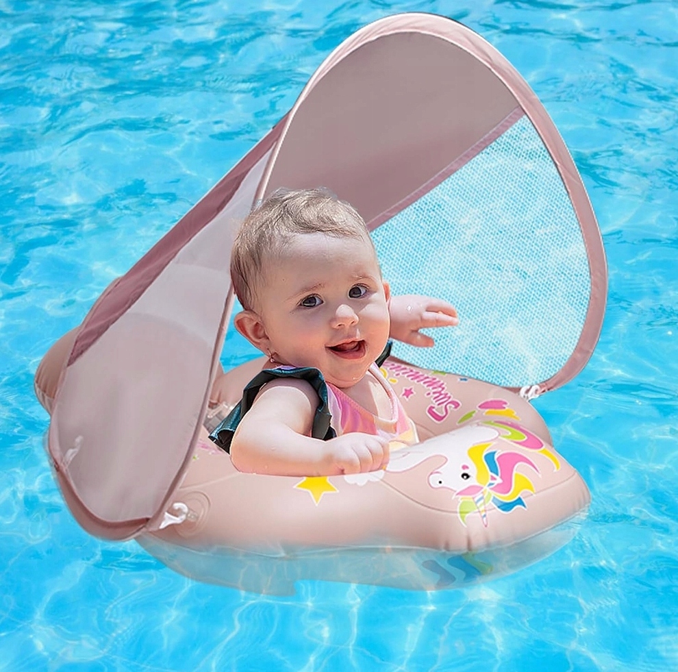 плавальний дах для немовлят забезпечує захист від сонця spf 50+, тримаючи сонце подалі від обличчя дитини. Пояс передміхурової залози підтримує яму і міцно утримує її, заважаючи дитині ковзати. Сторони з сітки забезпечують хорошу видимість і були розроблені, щоб допомогти дитині та батькам взаємодіяти та насолодитися часом, проведеним у басейні.
