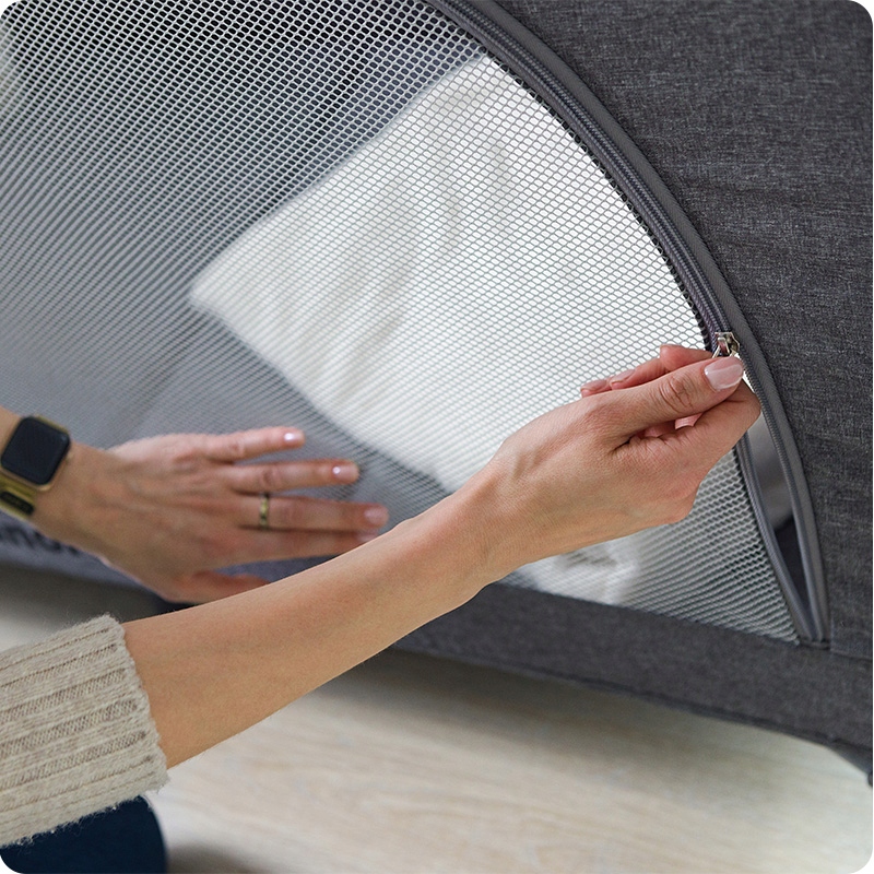 Так, ліжко має великий передній вхід, що закривається на блискавку, що забезпечує легкий доступ до дитини та полегшує їй входження і вийти сам.